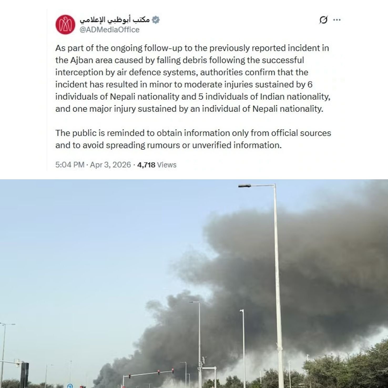 Five Indian nationals were among 12 people injured after debris from an intercepted aerial projectile fell in Abu Dhabi’s Ajban area. Authorities said all five Indians suffered minor injuries, while seven Nepali nationals were also hurt, including one seriously. The incident followed a fire at a nearby gas facility caused by interception debris. Officials did not specify the origin of the threat, but it comes amid escalating regional conflict involving Iran, the US, and Israel. Similar incidents in recent weeks have injured and killed foreign nationals in the UAE, highlighting growing risks to civilians as missile and drone interceptions increasingly occur over populated areas. (PC: India Today)