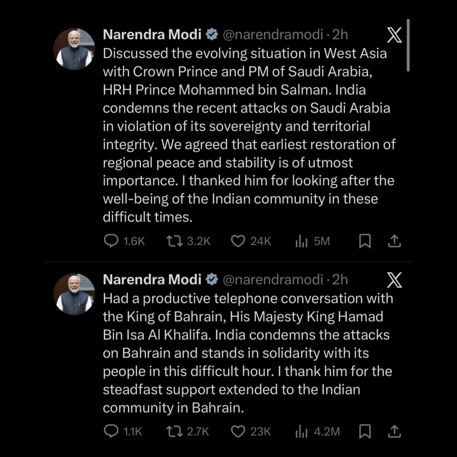 Prime Minister Narendra Modi held phone calls with Saudi Crown Prince Mohammed bin Salman and Bahrain’s King Hamad bin Isa Al Khalifa as tensions rose in West Asia. The talks came after US and Israeli strikes on Iran and Tehran’s missile response across the region. Modi said the situation is “a matter of concern” and stressed the need for peace and stability. He also discussed the safety of Indian citizens living in Gulf countries. On Sunday, Modi spoke with UAE President Sheikh Mohamed bin Zayed Al Nahyan and strongly condemned the recent attacks on the UAE. (PC: X)
