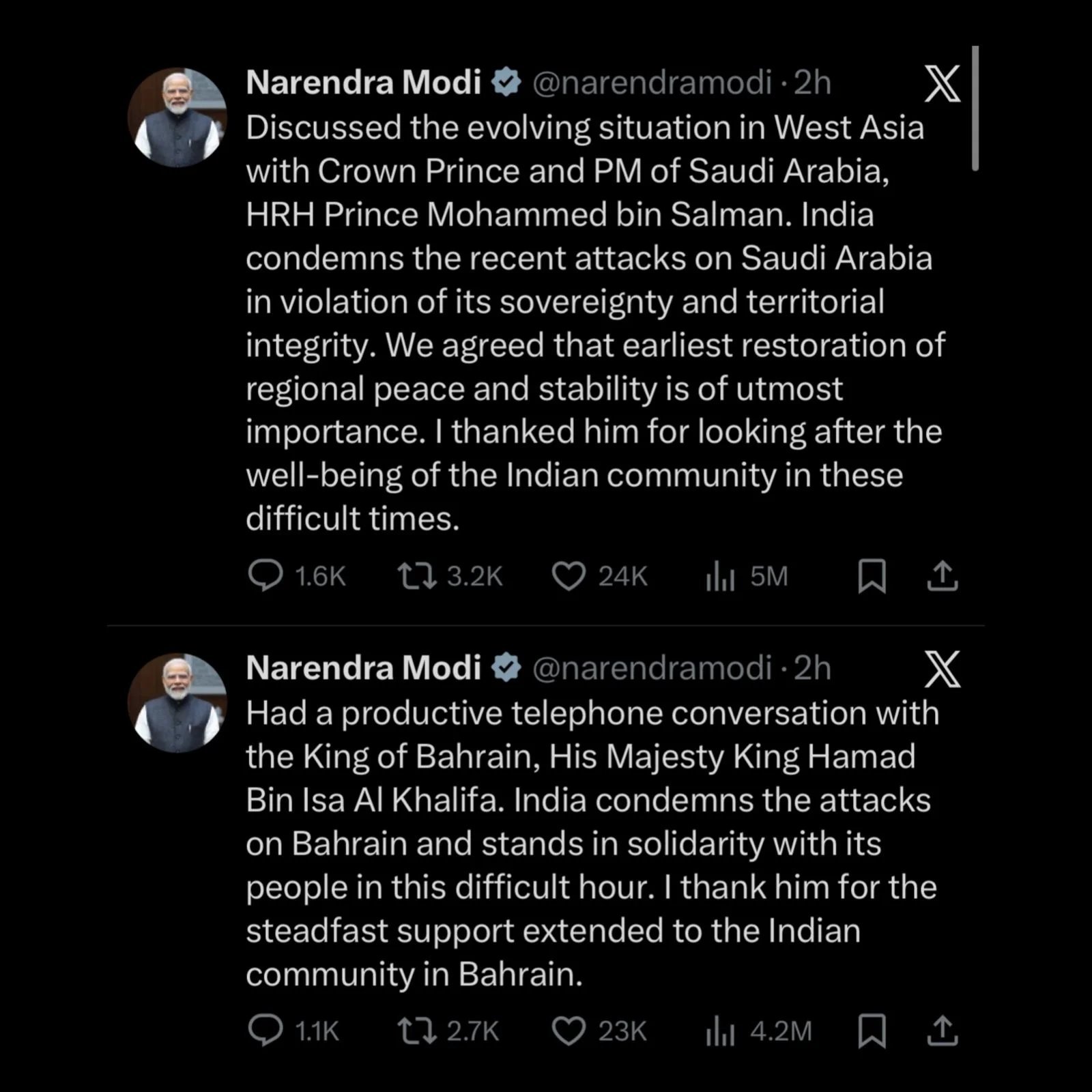 Prime Minister Narendra Modi spoke with Saudi Crown Prince Mohammed bin Salman and Bahrain’s King Hamad bin Isa Al Khalifa, thanking them for safeguarding the Indian community and urging the earliest restoration of regional peace and stability. Modi condemned recent attacks on Saudi Arabia and Bahrain as violations of sovereignty and territorial integrity, underscoring India’s call for de-escalation amid the Gulf’s ongoing conflict. The conversation occurred against a backdrop of heightened Gulf tensions and broader regional hostilities, with an aim to protect Indian nationals abroad.