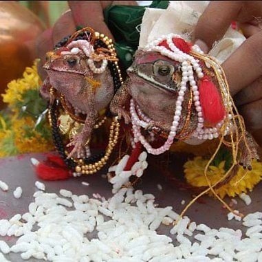 In a unique ceremony, a male and female frog were married in Varanasi, Uttar Pradesh, to appease the rain gods and bring relief from the heatwave. The ritual, attended by several people, aimed to please the gods and end the water crisis in various parts of India. A video shared on social media shows the frogs wrapped in traditional cloth, with a priest performing prayers and people singing traditional music. The unusual wedding ceremony is a desperate attempt to seek divine intervention for rain and relief from the scorching heat.