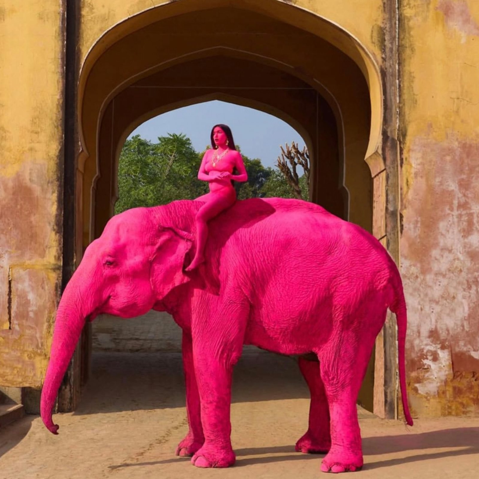 A photoshoot in Jaipur showing an elephant painted pink has triggered strong backlash online. Russian photographer Julia Buruleva shared images of a model posing on the painted animal at a temple site. Buruleva said, "We used organic, locally-made paint… it was absolutely safe for the animal." She added the idea came from Rajasthan’s cultural link with elephants. However, many users criticised the act. One comment said, "Turning an elephant into a pink prop… is deeply inappropriate." Others called it "animal abuse" and questioned using a live animal for art. Rajasthan forest officials said the matter will be investigated for any legal violations. (PC: Instagram)