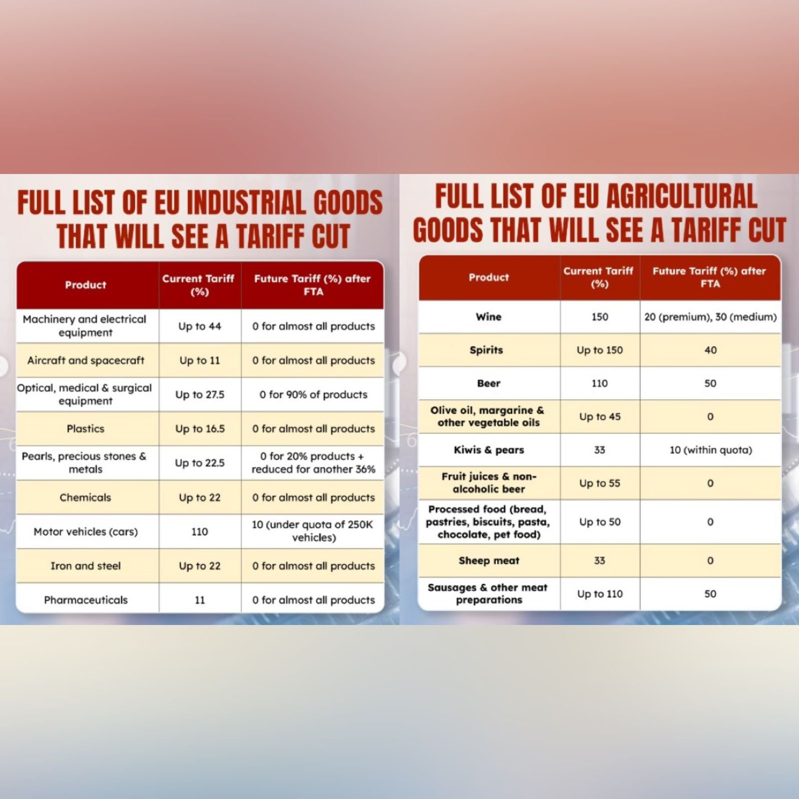India's historic trade deal with the EU eliminates tariffs on 96.6% of European exports, potentially making numerous products cheaper for Indian consumers. The agreement is one of the largest both parties have concluded, reduces duties from 50-150% to 0-20%, saving €4 billion annually. Key industrial goods seeing tariff cuts include machinery, aircraft, medical equipment, plastics, chemicals, and pharmaceuticals dropping to zero percent. Motor vehicles will decrease from 110% to 10%. Agricultural products like wine, spirits, beer, olive oil, processed foods, and meat will see significant reductions. Prime Minister Modi announced this deal represents 25% of global GDP and one-third of global trade, creating major opportunities for Indians and Europeans alike. (PC: Instagram/@HindustanTimes)