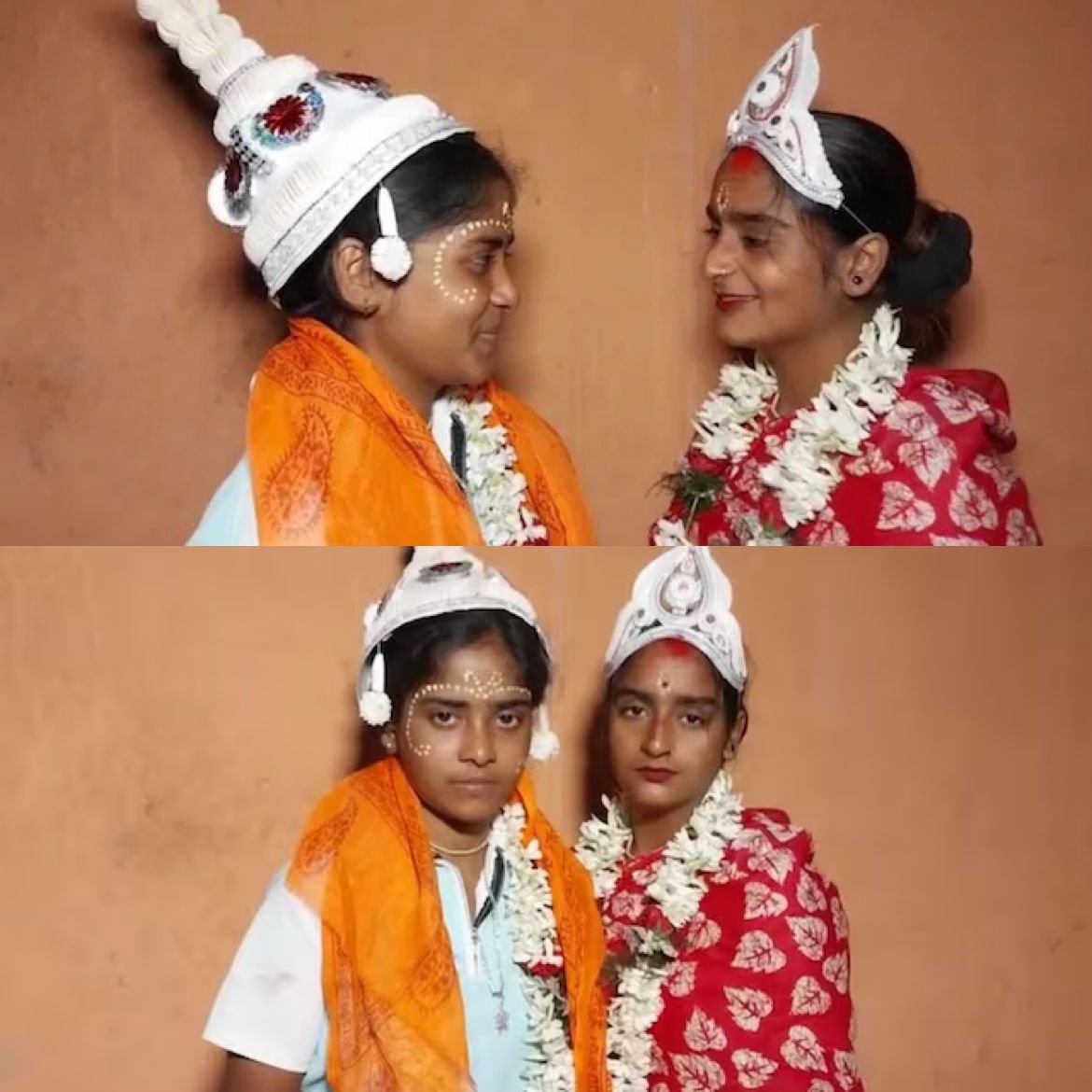 Two young women from West Bengal's Sundarbans defied societal norms by marrying at a local temple ceremony. Riya Sardar, 19, and Rakhi Naskar, 20, both professional dancers, met two years ago and developed a deep bond. While Riya's family opposed the relationship, Rakhi's family and villagers supported the couple, helping organize their simple wedding where they exchanged garlands. Riya, orphaned young and raised by relatives, showed remarkable courage following her heart. Though same-sex marriages lack legal recognition in India after the Supreme Court's October 2023 ruling denying fundamental rights to such unions, the couple's celebration reflects growing acceptance for relationships transcending gender boundaries in rural communities. (PC: India Today)