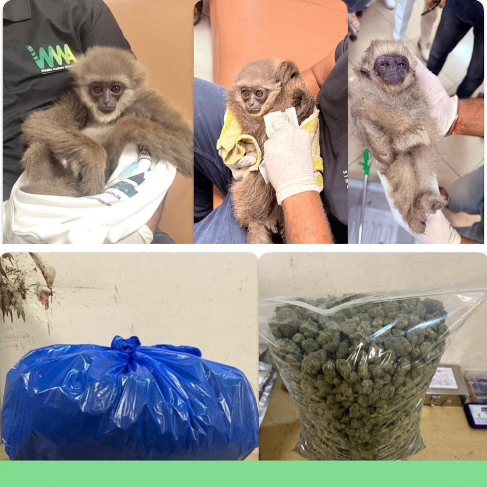 At Chhatrapati Shivaji Maharaj International Airport (CSMIA) in Mumbai, customs officers intercepted two major smuggling attempts. In the first case, a passenger arriving from Bangkok was found carrying two baby Silvery Gibbon apes—one alive and one dead—hidden inside a basket in a trolley bag. The gibbons are an endangered species. In the second case, officers seized 7.97 kg of alleged hydroponic marijuana worth approximately ₹8 crore, also arriving from Bangkok via checked baggage. Both individuals have been arrested under relevant wildlife and narcotics laws. (PC: X)