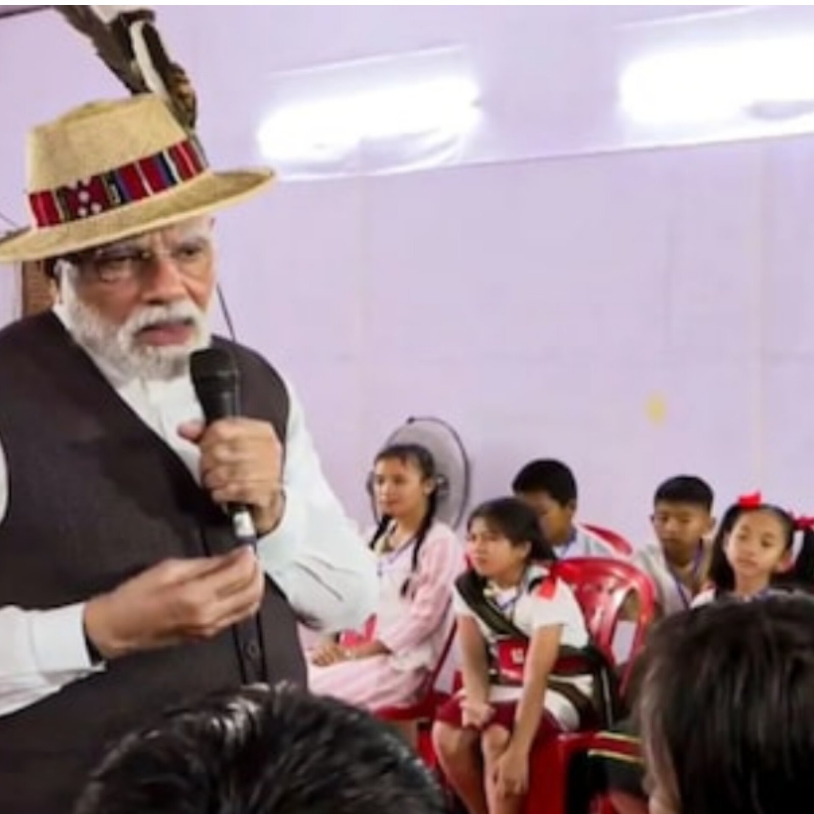 Prime Minister Narendra Modi visited Manipur’s Churachandpur today, his first trip since ethnic violence erupted in 2023. He met displaced families in relief camps and received a bouquet and painting from children. Modi wore a traditional hat gifted by locals. He laid the foundation of projects worth ₹7,300 crore, including roads, highways, and hostels for women. He said, “Peace is a must for development,” and announced 7,000 new homes for victims. He also highlighted ₹3,700 crore spent on highways and upcoming rail links to Imphal. The state has seen over 260 deaths and nearly 50,000 displaced since 2023. (PC: NDTV)