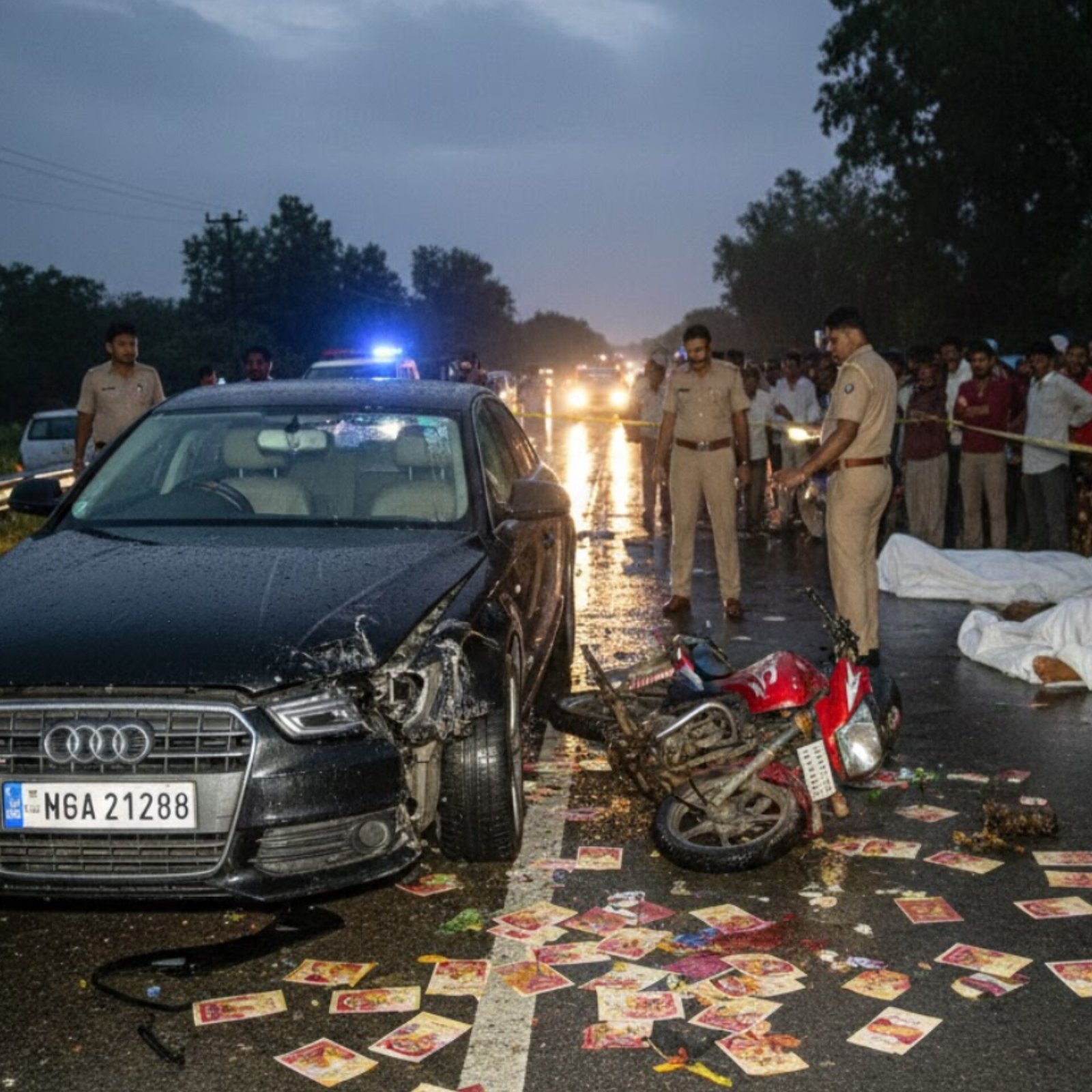 3 people, including a father and his son, were killed after a speeding Audi car hit their motorcycle in Rewa on Friday. The victims were identified as Bhagwat Vishwakarma, his younger son Rahul, and another family member. They were distributing wedding invitation cards when the accident happened near Koshta village. Police said the car was moving at very high speed and crushed the bike on impact. All three died on the spot. The Audi driver has been detained and the vehicle seized. A case has been registered and an investigation is underway. Locals raised concern over reckless driving on highways.