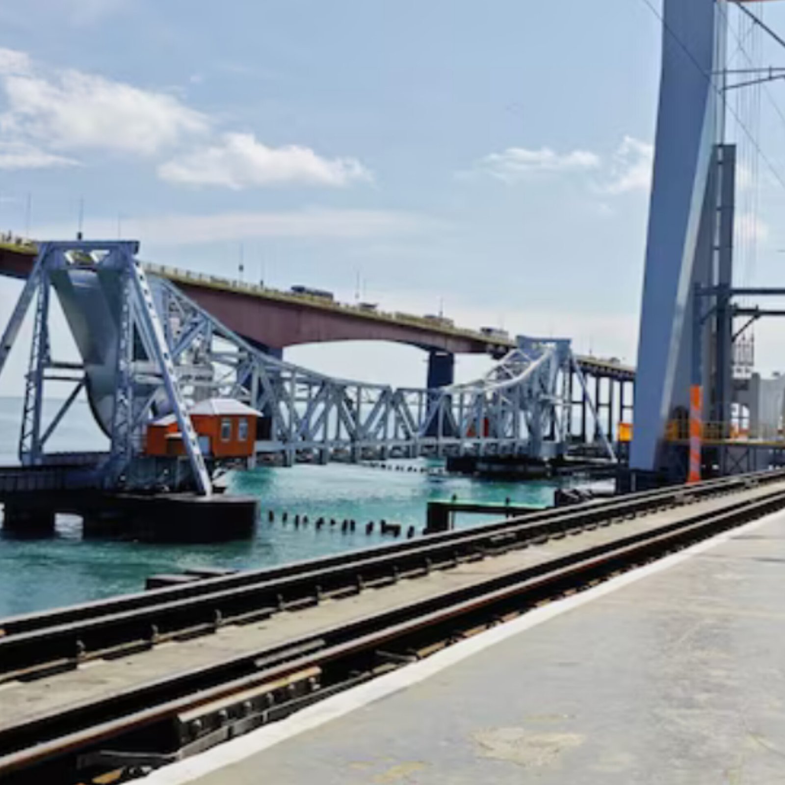 Prime Minister Narendra Modi inaugurated India's first vertical lift sea bridge, the New Pamban Bridge, on April 6, 2025, connecting Rameswaram to the mainland. Spanning 2.08 kilometers with 99 spans and a 72.5-meter vertical lift span, it allows ships to pass by elevating up to 17 meters. Constructed with stainless steel reinforcement and protective coatings, the bridge is designed for durability and minimal maintenance. It accommodates dual rail tracks to meet future demands. Replacing the original 1914 Pamban Bridge, this modern structure enhances connectivity for pilgrims, tourists, and trade. (PC: Mint & PTI)