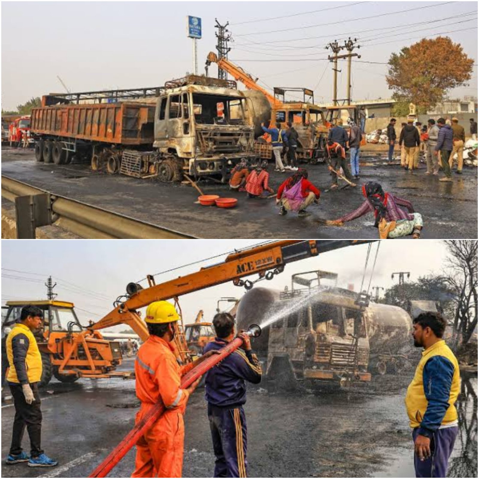 A gas tanker crash on the Jaipur-Ajmer highway early Friday caused a massive fire, killing 11 people and injuring over 35. Survivors described horrifying scenes. “Those who could jump out survived, but many were burned inside,” said an eyewitness. Flames and thick smoke were visible from a kilometre away. Over 30 vehicles were destroyed in the inferno. Another survivor recalled, “We heard a loud blast and broke the bus window to escape.” Rajasthan Chief Minister Bhajanlal Sharma visited the injured and ensured proper medical aid. Police are working to identify victims, and traffic on the highway remains blocked.