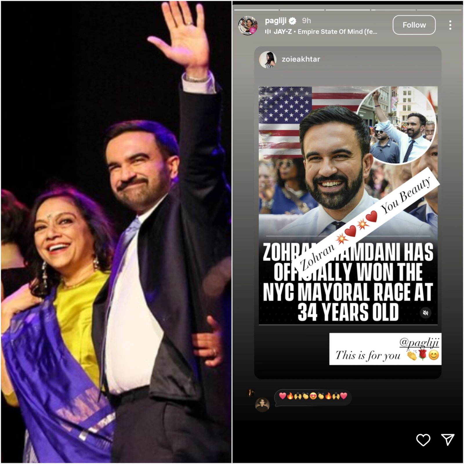 Filmmaker Mira Nair shared her first reaction to son Zohran Mamdani’s historic win in the New York mayoral election by resharing Zoya Akhtar’s Instagram story. Akhtar had written, “Zohran you beauty,” with emojis of hearts and fireworks, celebrating the 34-year-old’s victory. Mamdani, son of Nair and historian Mahmood Mamdani, defeated former governor Andrew Cuomo and Republican Curtis Sliwa to become the city’s youngest and first Indian-origin mayor. In his victory speech, Mamdani called it a “mandate for change.” Nair’s proud reshare quickly went viral, with fans and film industry colleagues congratulating her on her son’s political success. (PC: X)
