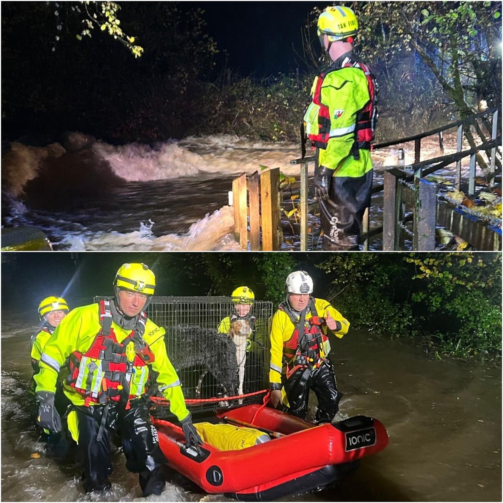 Heavy flooding in southwest Wales led to a major incident on Wednesday, with emergency crews rescuing dozens of people and animals. More than 450 emergency calls were made overnight, mainly from the Carmarthenshire area. Forty-eight residents were rescued from a care home, while over 40 others were saved from flooded houses. Firefighters also rescued three people trapped in fast-flowing water and over 30 dogs from a flooded shelter in Kidwelly. Roads were closed, and schools shut down as rivers overflowed. Officials praised rescue teams for their courage and urged residents to stay alert amid ongoing flood warnings across Wales. (PC: MAWWFRS)