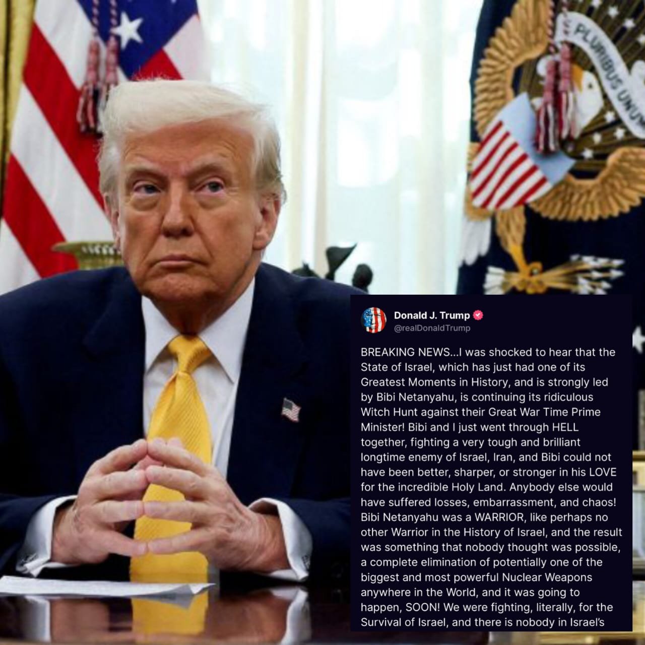 Former U.S. President Donald Trump has urged Israel to immediately cancel or pardon Prime Minister Benjamin Netanyahu’s ongoing corruption trial, describing it as a politically motivated “witch hunt” . Speaking on Truth Social on June 25, 2025, Trump praised Netanyahu as a “great hero” and “wartime prime minister,” asserting that the United States would “save Bibi Netanyahu” as it did Israel . The trial, stemming from 2019 bribery, fraud, and breach-of-trust charges, began in 2020 and entered cross-examination on June 3, expected to last a year . Israeli President Herzog has stated that no pardon request has been made. (PC: X)