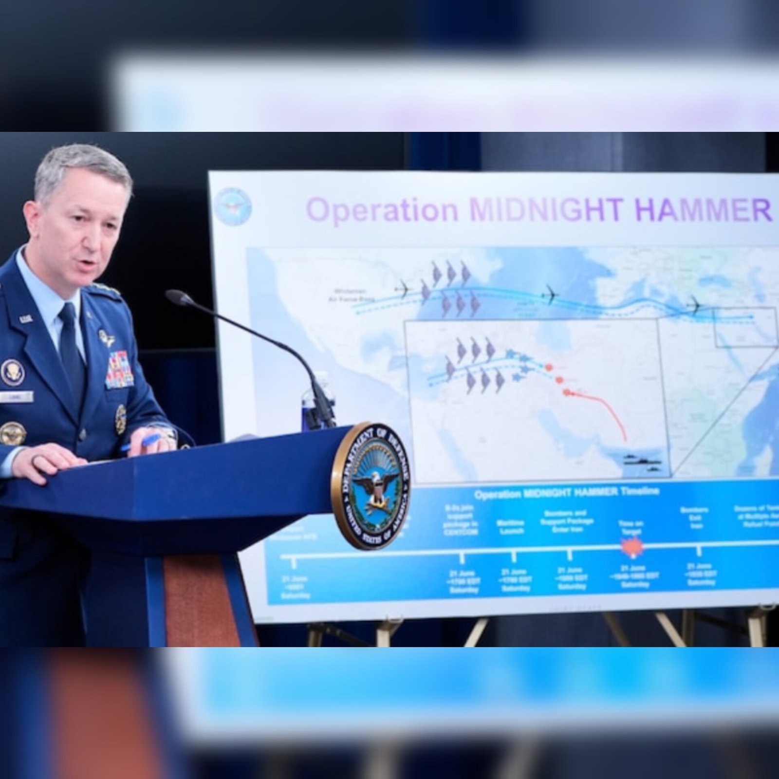 The US attacked Iran’s nuclear sites on Saturday in a mission called Operation Midnight Hammer, using over 125 aircraft and a smart decoy plan. General Dan Caine said seven stealth B-2 bombers dropped massive 30,000-pound bombs on Fordow and Natanz, while missiles hit Isfahan. The strike began at 6:40 pm ET and ended in just 25 minutes. A US submarine also fired over 24 Tomahawk missiles. Bombers flew from Missouri and returned safely. “No shots were fired at our planes,” said Caine. The mission was the longest B-2 flight since 9/11. The US aimed to stop Iran’s nuclear threat quickly. (PC: AP)