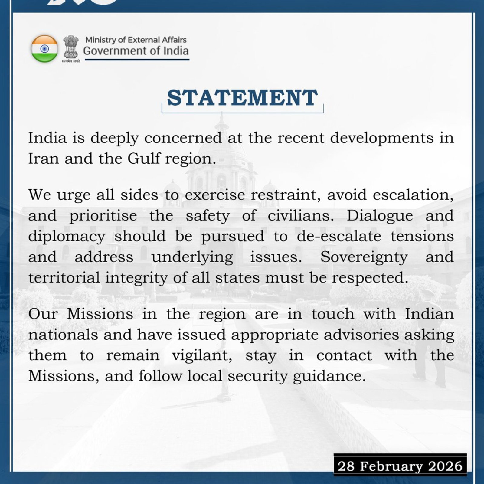 India has expressed deep concern over the recent joint military strikes by the United States and Israel on Iran and the resulting escalation in the Middle East. New Delhi’s Ministry of External Affairs urged all parties to exercise restraint, avoid further escalation, and prioritise the safety of civilians, while emphasising that the sovereignty and territorial integrity of all states must be respected. India highlighted the importance of dialogue and diplomacy as the only means to de-escalate tensions and address underlying issues. Indian missions across the Gulf region have issued advisories to nationals to remain vigilant and stay in contact with embassies amid uncertainty. (PC: X)