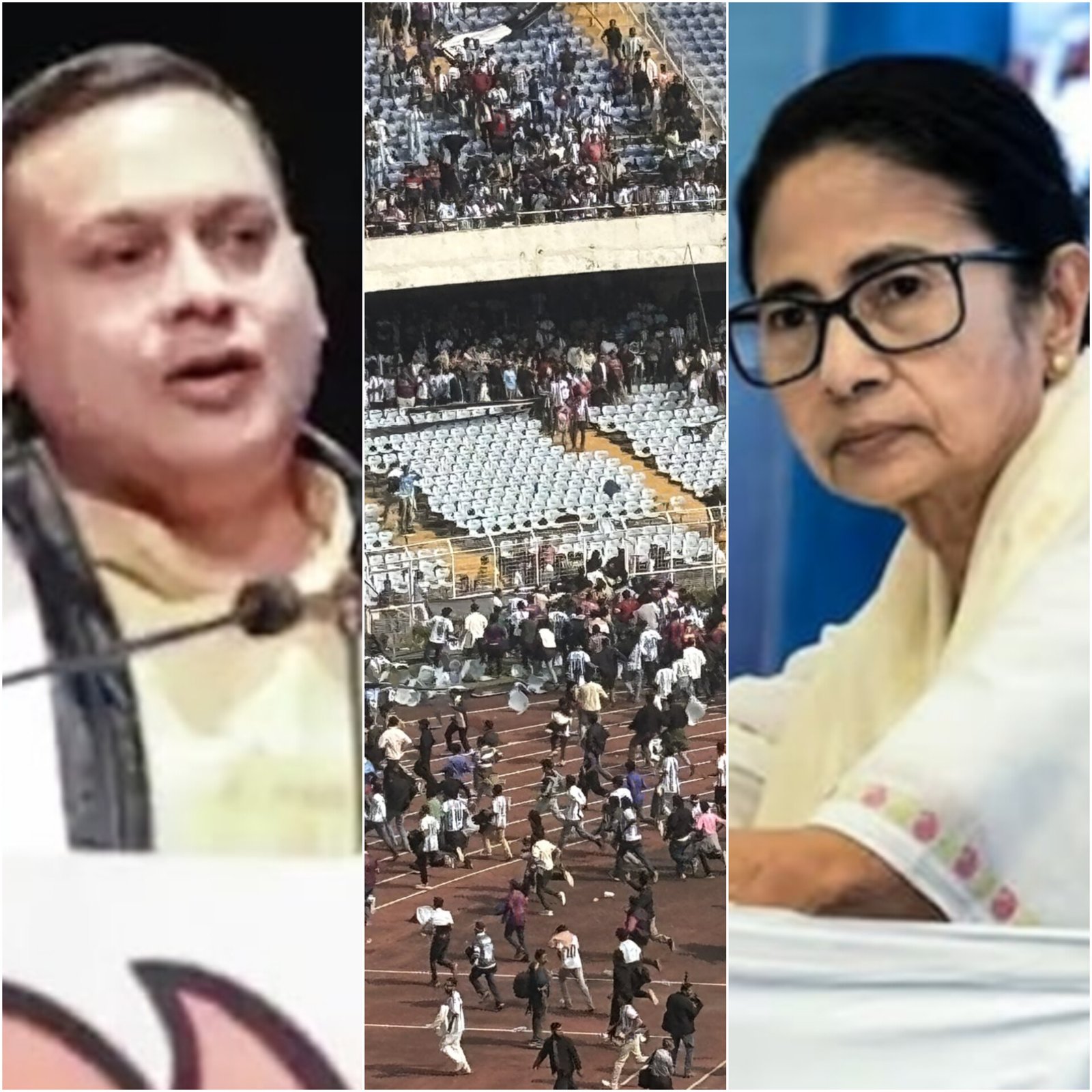 Kolkata stadium descended into chaos during Lionel Messi’s G.O.A.T India Tour visit on Saturday. Messi left after just 10 minutes due to mismanagement, leaving fans who paid high ticket prices disappointed. Spectators vandalised stadium property in protest. BJP blamed the Trinamool Congress for the disorder, calling it an insult to Bengal and demanding resignations and refunds. TMC said the event was organised by a private company and apologised for the incident. Videos of the unrest circulated online. The visit, including the unveiling of a 70-foot Messi statue, ended prematurely, cutting short planned engagements with Mamata Banerjee and other dignitaries. (PC: India Today)