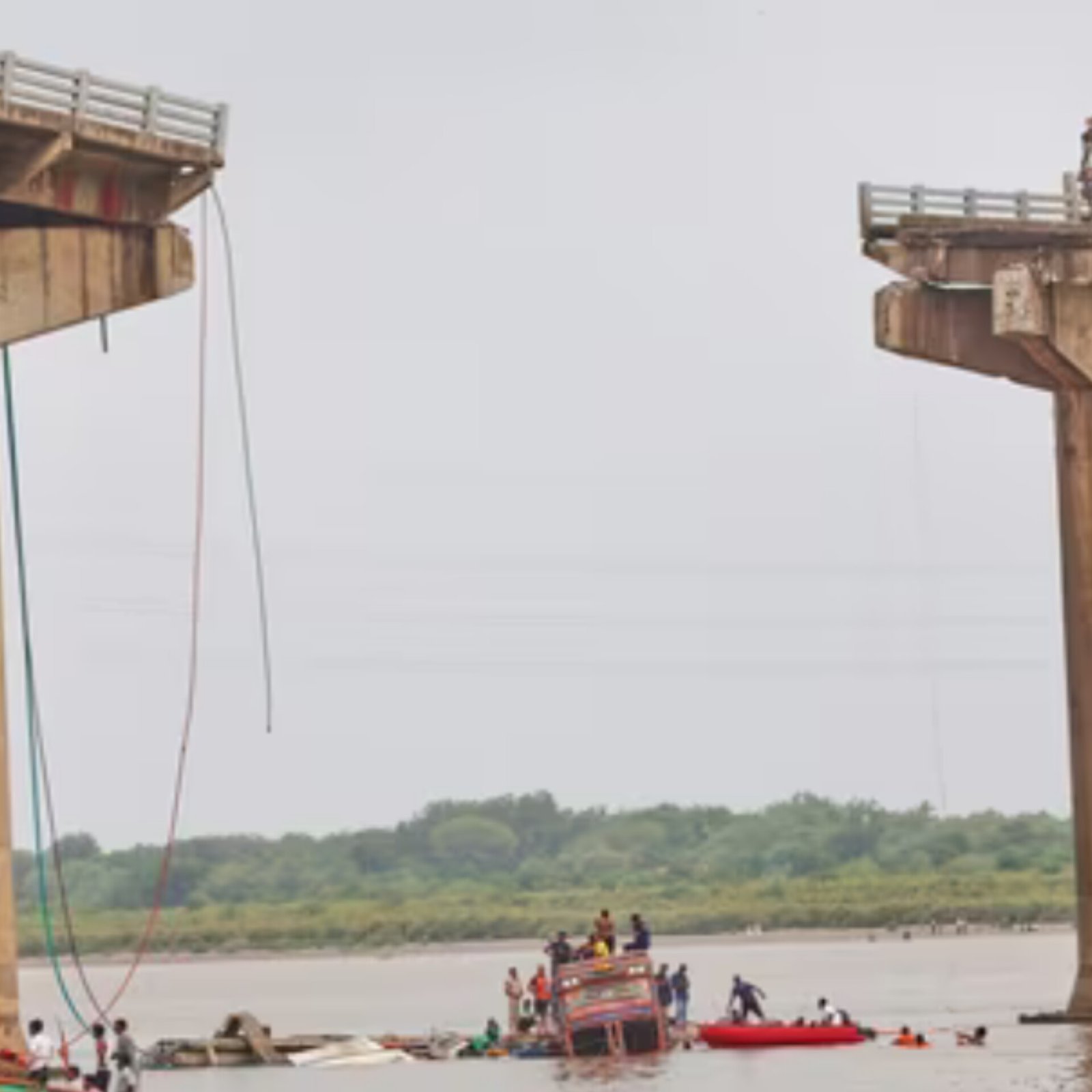 At least 10 people died after a part of the Gambhira Bridge in Vadodara, Gujarat, collapsed on Wednesday. Five vehicles, including two trucks and an auto-rickshaw, fell into the Mahisagar River. Rescue work is still going on. Opposition leaders blamed the BJP government. The Trinamool Congress asked, “Is this an act of God or an act of fraud?” Congress said locals had warned that the bridge was shaking. Supriya Shrinate called the “Gujarat Model” a symbol of corruption. PM Modi said the incident was “deeply saddening” and announced ₹2 lakh for families of the dead, ₹50,000 for the injured. (PC: AP)