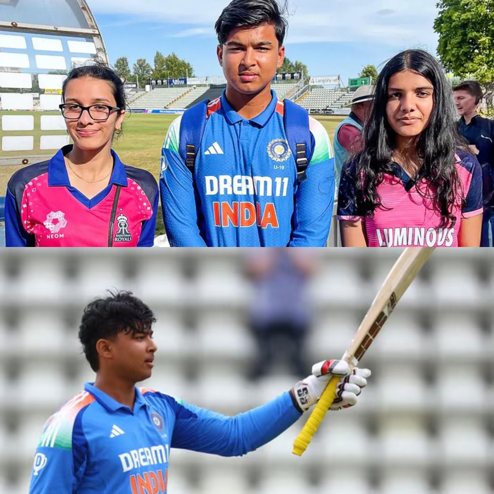 Vaibhav Suryavanshi, the 14-year-old cricket prodigy, has ignited fan frenzy in England during the India U19 tour. Known for his explosive batting, he smashed a record-breaking 143 off 52 balls in the fourth Youth ODI, the fastest century in the format. His IPL heroics with Rajasthan Royals, including a 35-ball century, made him a household name. Two teenage fans, Aanya and Rivaa, drove six hours to Worcester just to meet him, wearing Royals jerseys and cheering for Team India. Rajasthan Royals celebrated the moment on social media, calling it proof of unmatched fan devotion. India won the five-match series 3–2, with Suryavanshi’s brilliance leading the charge. (PC: Hindustan Times & NDTV)