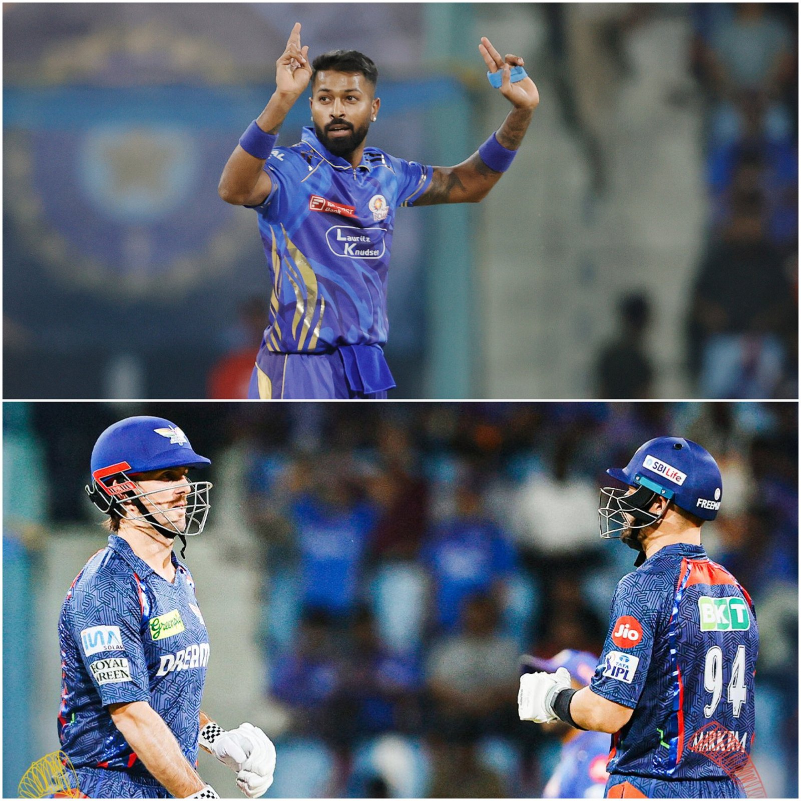 Lucknow Super Giants (LSG) defeated Mumbai Indians (MI) by 12 runs in a thrilling IPL 2025 clash at the Ekana Stadium on Friday. Despite Hardik Pandya’s maiden T20 five-wicket haul, MI fell short while chasing 204. LSG posted 203/8, powered by quick fifties from Mitchell Marsh and Aiden Markram. Rishabh Pant failed with the bat, but LSG’s bowlers held their nerve in the final overs. MI, missing Rohit Sharma due to a knee injury, couldn’t recover despite Pandya’s all-round brilliance. Both teams were eyeing their second win of the season after losing two matches each earlier in the tournament. (PC: BCCI)