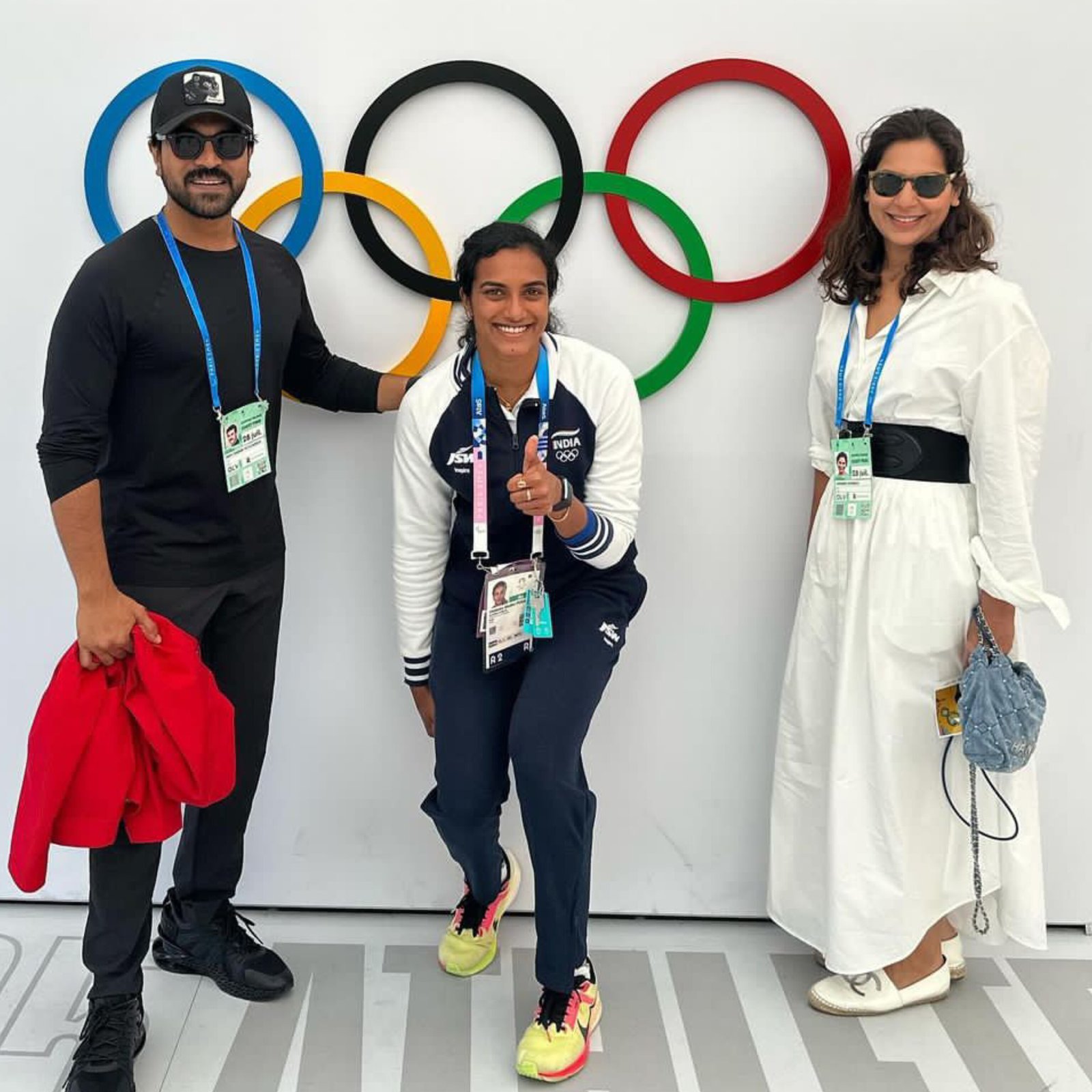 Badminton star PV Sindhu welcomed actor Ram Charan and his wife Upasana to the Paris Olympics. The couple cheered for her during her match against Maldives' Fathimath Abdul Razzaq. Upasana shared videos on Instagram, showing their day with PV. Sindhu gave them a tour of the Olympic Village and played with their dog, Rhyme. Ram and Upasana posted pictures with PV, praising her as a "true rock star." Ram Charan, his wife, and parents attended the opening ceremony, marking a historic event as it was held outside the stadium for the first time.