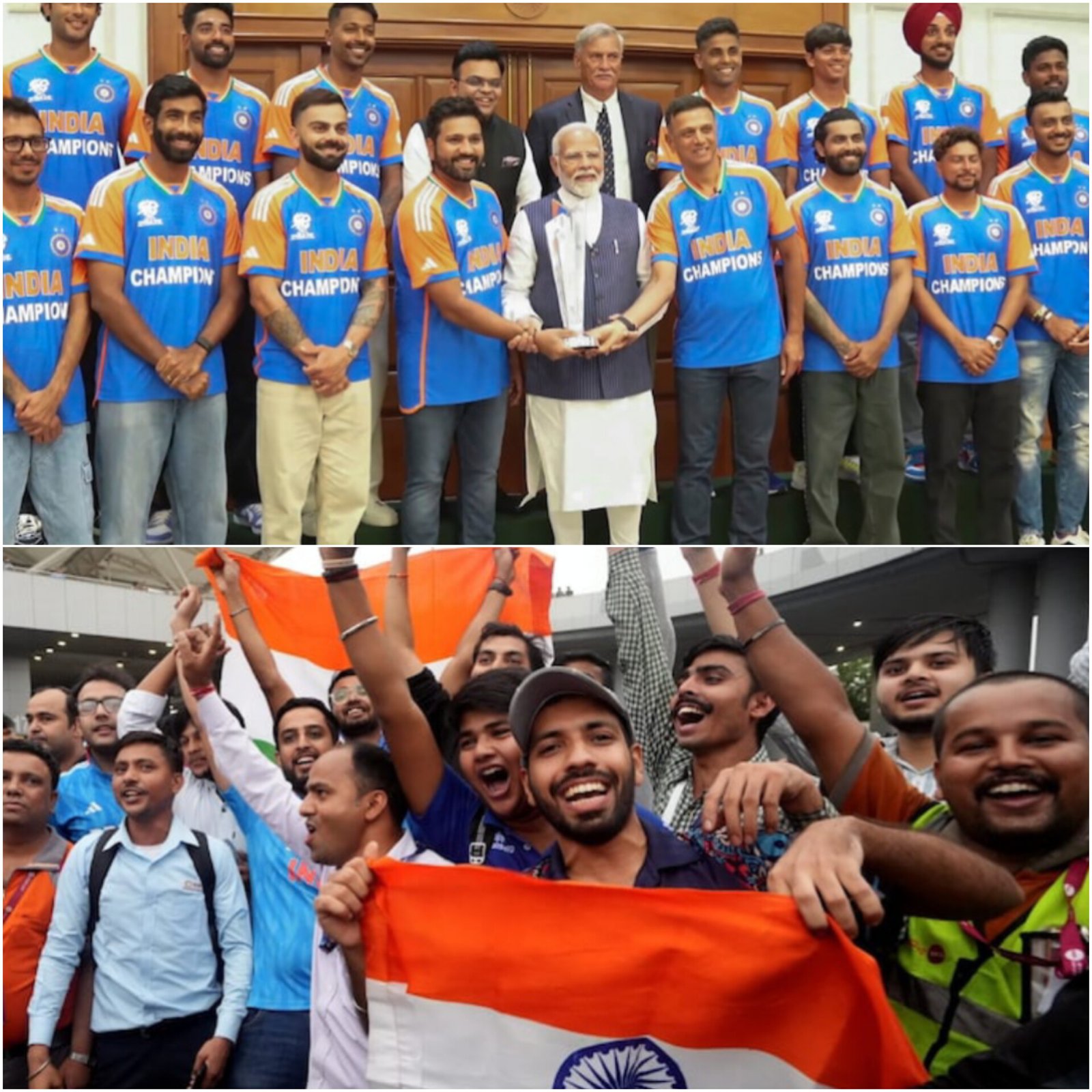 India’s T20 World Cup-winning team, led by Rohit Sharma, was celebrated by Prime Minister Narendra Modi at his residence after their delayed return from the Caribbean due to Hurricane Beryl. Fans welcomed the team early Thursday with flags and placards. Virat Kohli shared a special message on X, praising PM Modi for hosting them and sharing experiences of their World Cup journey. The squad, donning jerseys marked “Champions,” will continue celebrations with a victory parade and felicitation at Mumbai’s Wankhede Stadium.