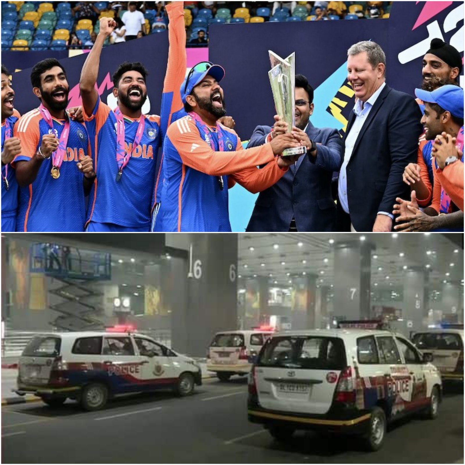 The Indian cricket team has finally arrived at Indira Gandhi International Airport today, fresh from their T20 World Cup triumph. The team, led by Rohit Sharma, landed at 6:05 AM and was greeted by hundreds of enthusiastic fans, braving the weather to welcome their heroes. Rohit emerged from the airport holding the coveted trophy, leaving fans spellbound. The team's historic victory over South Africa in the final on Saturday was celebrated by supporters waving national flags and congratulatory placards. The players boarded their team bus, basking in the glory of their seven-run win in Bridgetown. A grand celebration awaits the champions!