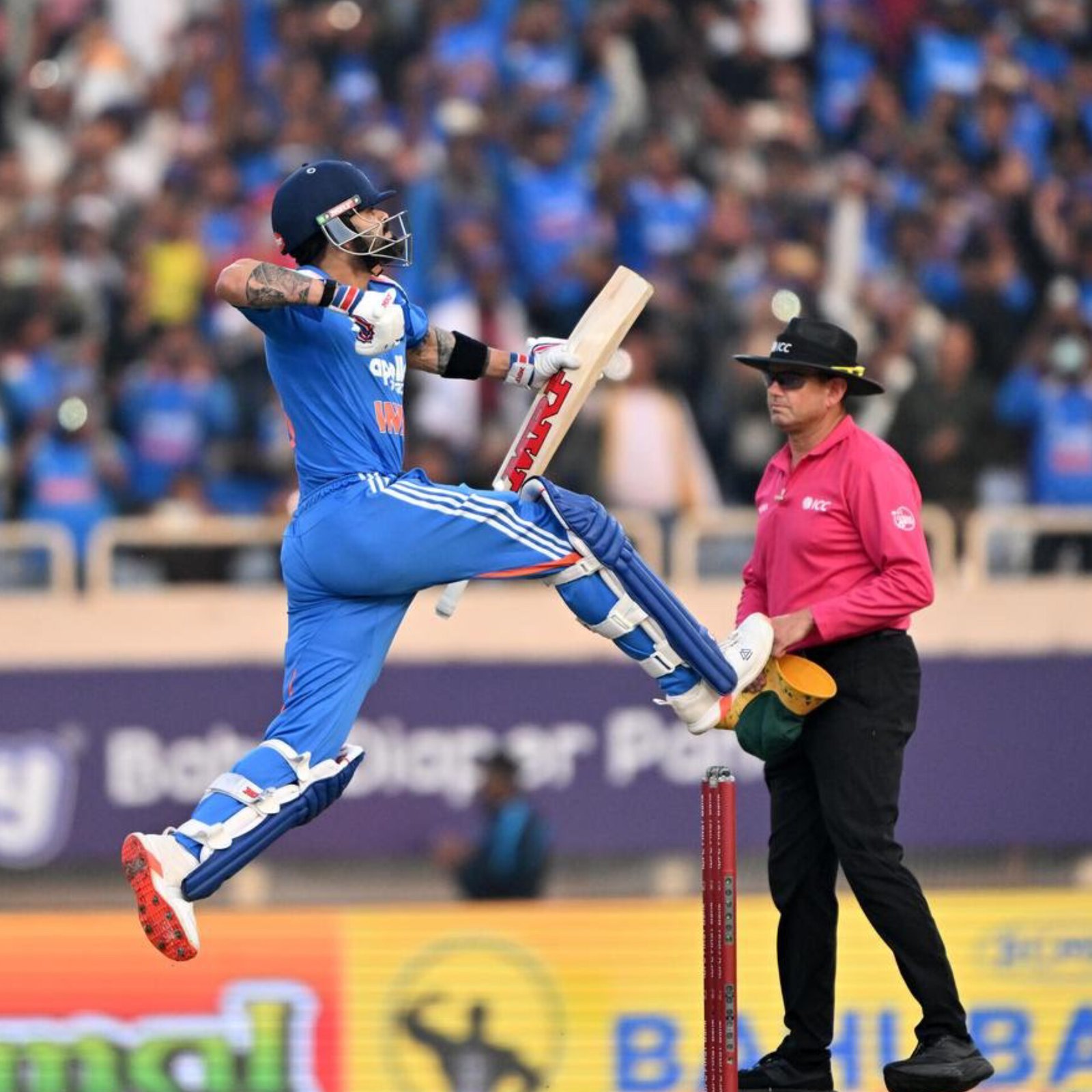 Virat Kohli scored his 52nd ODI century in the first match against South Africa in Ranchi, and his milestone sparked a viral moment. When Kohli hit a boundary to reach the hundred, cameras caught Rohit Sharma jumping up in the dressing room and celebrating with loud, excited reactions. His raw and unfiltered joy spread quickly on social media. Earlier, Rohit and Kohli added a 136-run stand, showing strong teamwork. Kohli finished with 135 runs, while Rohit scored 57 and broke the record for most ODI sixes. Their partnership helped India post 349 for 8 in the opening ODI.