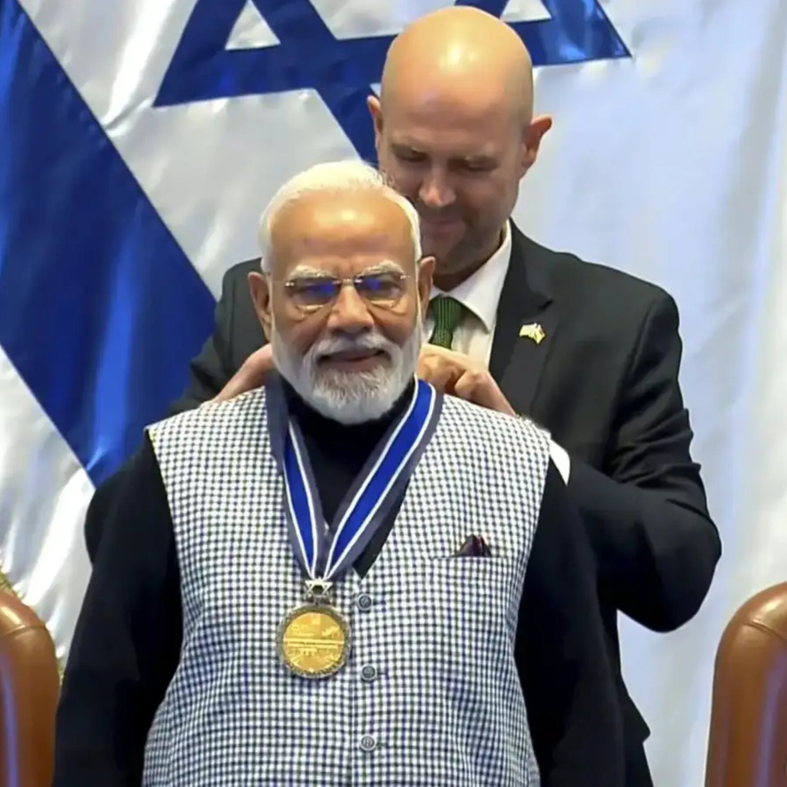 Prime Minister Narendra Modi was awarded the “Speaker of the Knesset Medal” by Israel’s Parliament on Wednesday. He is the first Indian Prime Minister to receive the honour. Knesset Speaker Amir Ohana presented the medal after Modi addressed the Israeli Parliament. The award recognises his role in strengthening strategic ties between India and Israel. Israeli Prime Minister Benjamin Netanyahu welcomed Modi and called him “a great friend of Israel” and “a champion of the Indian-Israeli alliance.” This is Modi’s second visit to Israel. Bilateral ties were raised to a strategic partnership during his 2017 visit. (PC: HT)