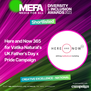 London's Multicultural marketing agency Here and Now365 gets nominated for Creative Excellence at the inaugural Media For All Diversity & Inclusion Awards (MEFA) 2023. The agency was recognized for its Vatika Naturals UK ad "#UnbreakableBonds, UK Father's Day x Pride." Nominations closed on October 23 and judges chaired by WPP's Karen Blackett selected 34 finalists across 6 categories. Here and Now365 founder, Manish Tiwari said: "Multiculturalism is at the core of our values as it is for modern Britain. Happy to be recognized by MEFA for our efforts." Winners will be announced at the awards ceremony on November 21, 2023. MEFA founder Naren Patel welcomed sponsor Sky's support, saying it reflects a "commitment to celebrating DE&I excellence." With its nomination, Here and Now365's creative #UnbreakableBonds ad highlighted its commitment to diversity and inclusion. [Click the LINK below to see all the nominations]