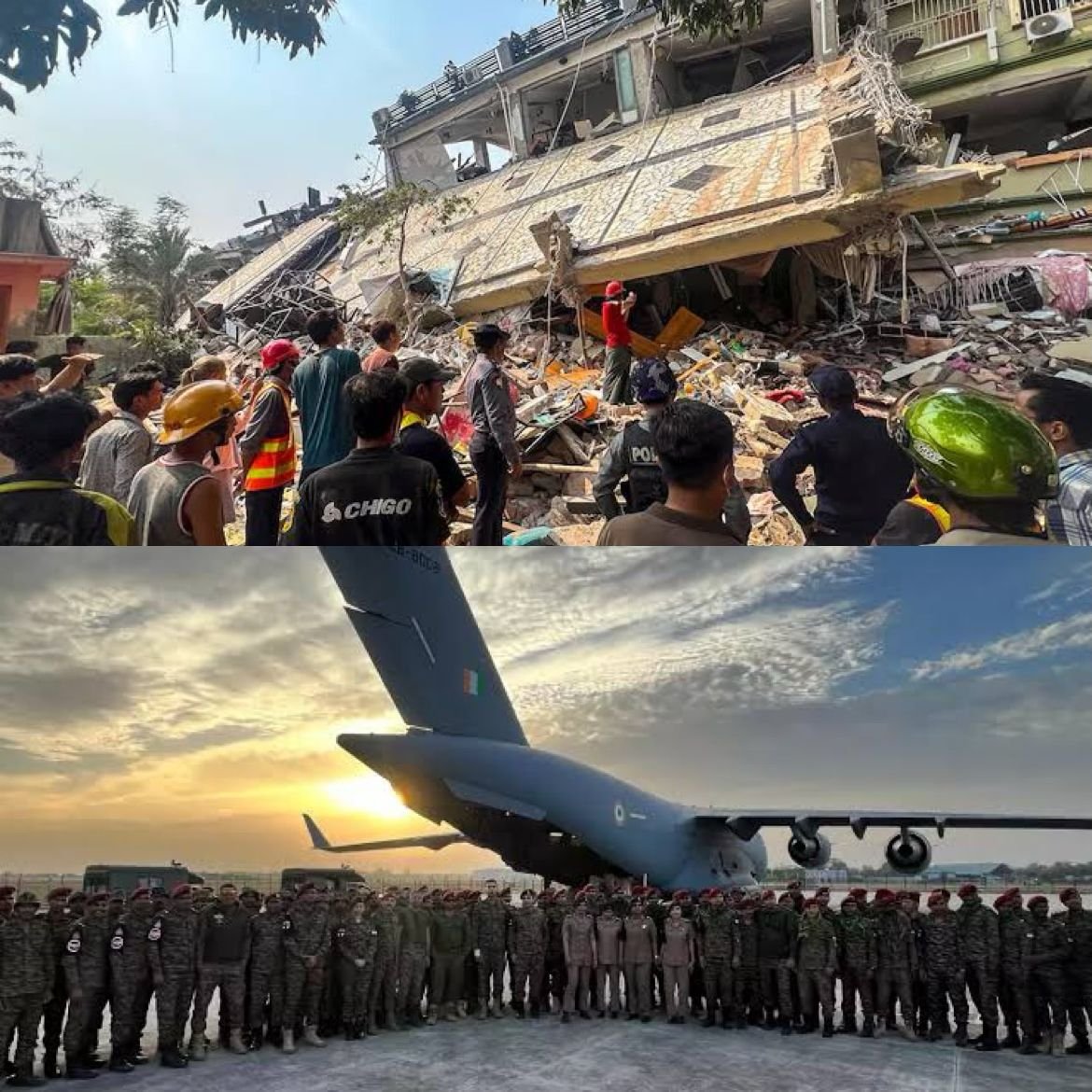 Recently a devastating 7.7-magnitude earthquake struck Myanmar, resulting in over 1,700 fatalities and widespread destruction. India promptly launched 'Operation Brahma,' dispatching naval ships with 30 tonnes of relief materials and deploying an army field hospital with 118 medical personnel to assist the affected regions. The United States, China, and other nations have also extended aid, sending rescue teams, medical supplies, and financial assistance to support relief efforts. Despite these international contributions, ongoing civil conflict and infrastructural challenges in Myanmar continue to impede effective distribution of aid and rescue operations. (PC: The Economic Times & Somoy TV)