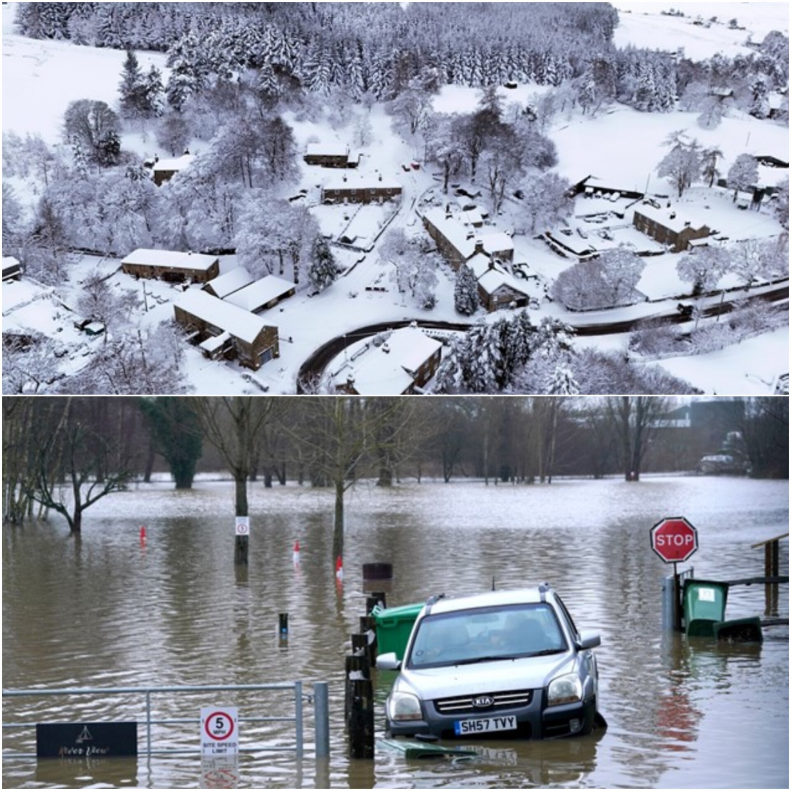 The UK faces severe weather disruption with 67 flood warnings and 262 alerts issued. Melting snow and rain have caused significant river flooding, particularly in Lancashire and Cumbria, under amber weather warnings. Up to 15 cm of snow is expected, cutting off rural communities and causing travel chaos. Airports and roads have been severely impacted, while the Met Office predicts below-average temperatures and widespread frost across the country. The UK Health Security Agency has issued cold weather alerts, warning of increased health risks for vulnerable groups. More snow and ice are forecast midweek, worsening conditions across southern and central England.