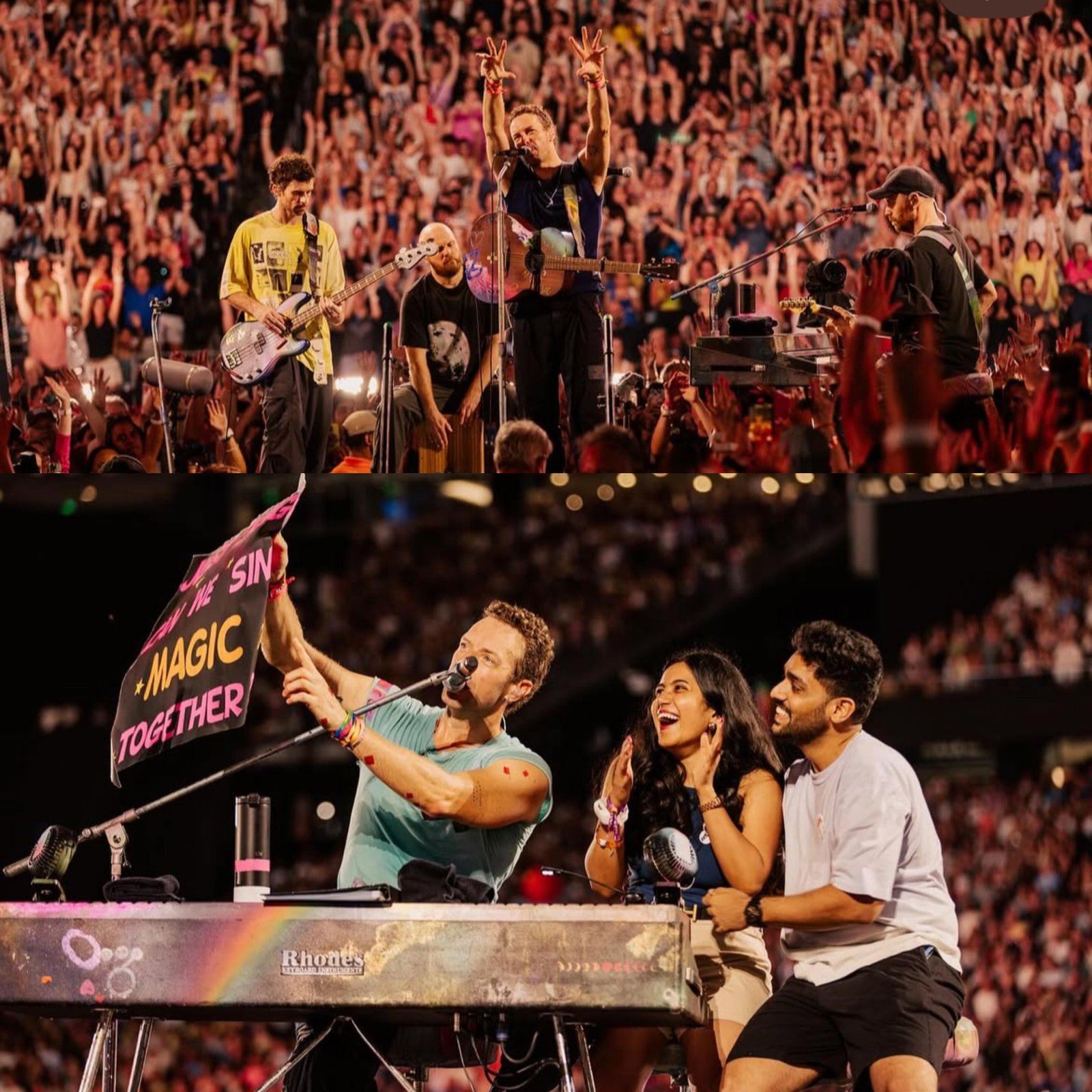 Coldplay’s Gillette Stadium concert in Massachusetts made headlines for two viral moments. While Astronomer CEO Andy Byron’s awkward “kiss cam” appearance with HR head Kristin Cabot sparked speculation, a heartwarming twist stole the spotlight. Chris Martin paused mid-performance after spotting a handmade sign from a newly engaged Indian couple requesting to sing “Magic.” He invited them on stage, joked about their engagement, and personalized the lyrics with their names. The moment ended with a warm hug and crowd applause. Fans online dubbed it the true highlight of the night, overshadowing the “Coldplaygate” drama and turning the couple’s gesture into a viral sensation. (PC: Instagram/Coldplay)