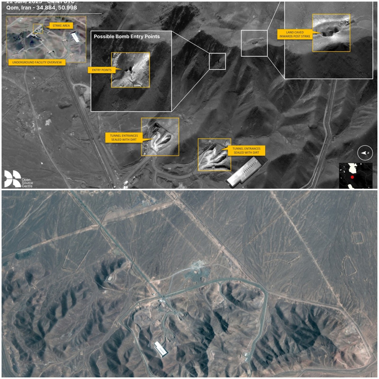 Post-strike satellite images show extensive damage at Iran's Fordow nuclear facility after a US airstrike using bunker-buster bombs. The US struck Fordow, Natanz, and Esfahan with six GBU-57 bombs and 30 Tomahawk missiles, targeting deeply buried uranium enrichment sites. President Donald Trump hailed the attack as “very successful.” The Fordow site, located under a mountain near Qom, showed signs of caved-in terrain and sealed tunnel entrances. Iran claims the sites had been evacuated earlier, with no risk of radiation. The International Atomic Energy Agency noted uranium at Fordow had been enriched to 83.7% purity—close to bomb-grade levels. (PC: NDTV)