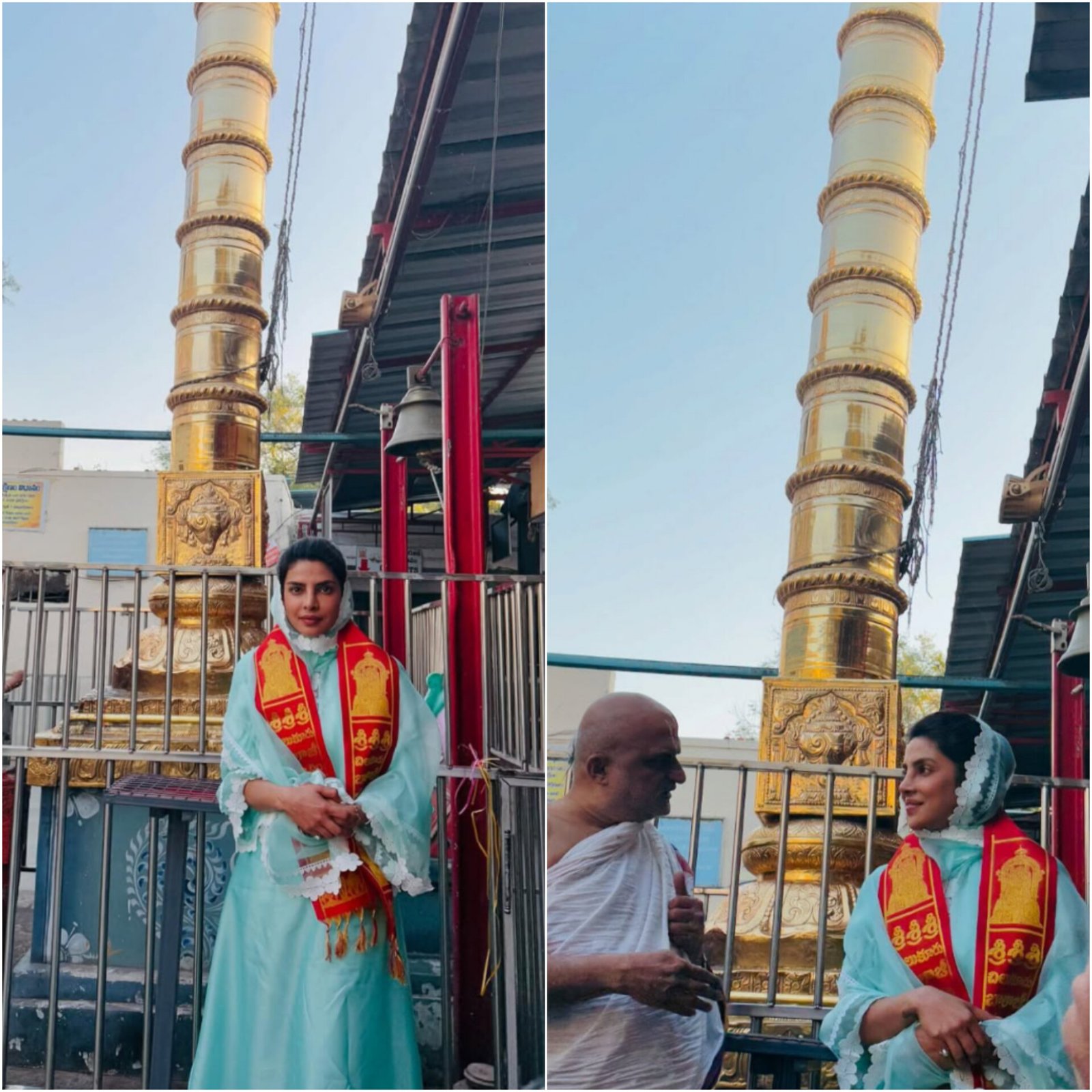Priyanka Chopra visited Chilkur Balaji Temple in Telangana, sparking excitement about her upcoming projects. She wore a light blue salwar suit and shared pictures of her seeking blessings. In her Instagram post, Priyanka wrote, “With the blessings of Shri Balaji, a new chapter begins,” adding a prayer for peace and prosperity. Fans speculate she might announce her role in SS Rajamouli’s Mahesh Babu-starrer SSMB 29. Priyanka recently traveled from Toronto to Hyderabad and teased her journey with an Om emoji and music from RRR. The much-anticipated action-adventure film’s details remain under wraps, building further anticipation.