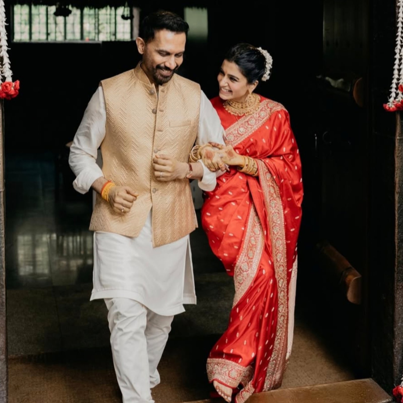 Actor Samantha Ruth Prabhu and filmmaker Raj Nidimoru got married on Monday at the Isha Foundation in Coimbatore. Samantha shared pictures of their ring exchange and wedding ceremony on Instagram, making the news official. The couple performed a traditional ceremony in front of Linga Bhairavi, took aarti, and posed with smiles for photos. Raj wore a white kurta with a beige Nehru jacket, while Samantha looked stunning in a red and gold saree with fresh flowers in her hair. Celebrities and fans congratulated them online. The couple had been dating since early 2024 amid public speculation. (PC: Instagram)