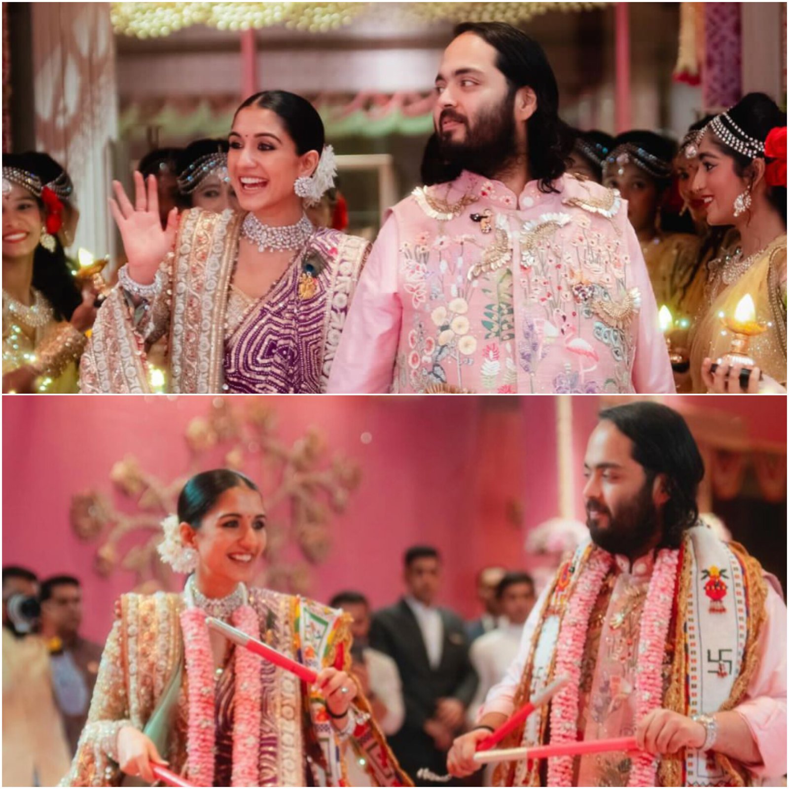 Anant Ambani and Radhika Merchant celebrated their garba night on July 9, ahead of their wedding. Hosted by Radhika's family, the event featured vibrant decorations, music, dance, and traditional cuisine. Radhika wore a purple lehenga, styled with diamonds, while Anant donned a pink kurta set designed by Rahul Mishra. Pictures from the night were shared on Instagram by stylist Shaleena Nathani. The couple’s wedding festivities began with a puja on June 29 and will continue with ceremonies from July 12 to 14 at the Jio World Convention Centre in Mumbai.
