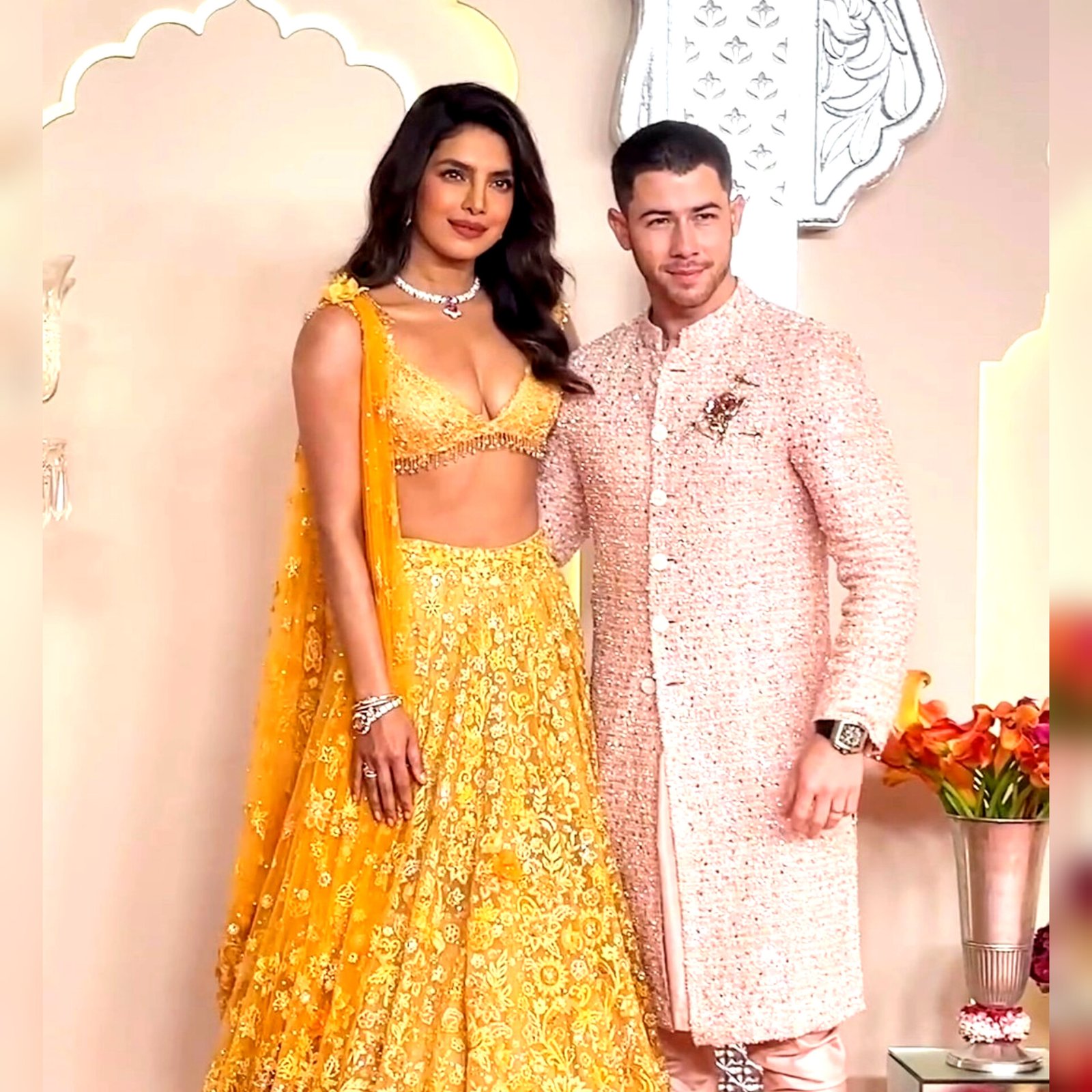Priyanka Chopra and Nick Jonas dazzled at Anant Ambani and Radhika Merchant's wedding in Mumbai. Priyanka adorned a stunning butter yellow lehenga choli by Tarun Tahiliani, while Nick looked dapper in a powder pink Sabyasachi sherwani. Their arrival was marked by a joyful Instagram post from Nick capturing their playful moments en route. The extravagant affair, hosted by Mukesh Ambani's family, featured Bollywood stars, international celebrities, and cricket legends. The event also showcased cultural tributes, including a special homage to Kashi. The wedding continues to garner global attention for its opulence and star-studded guest list.