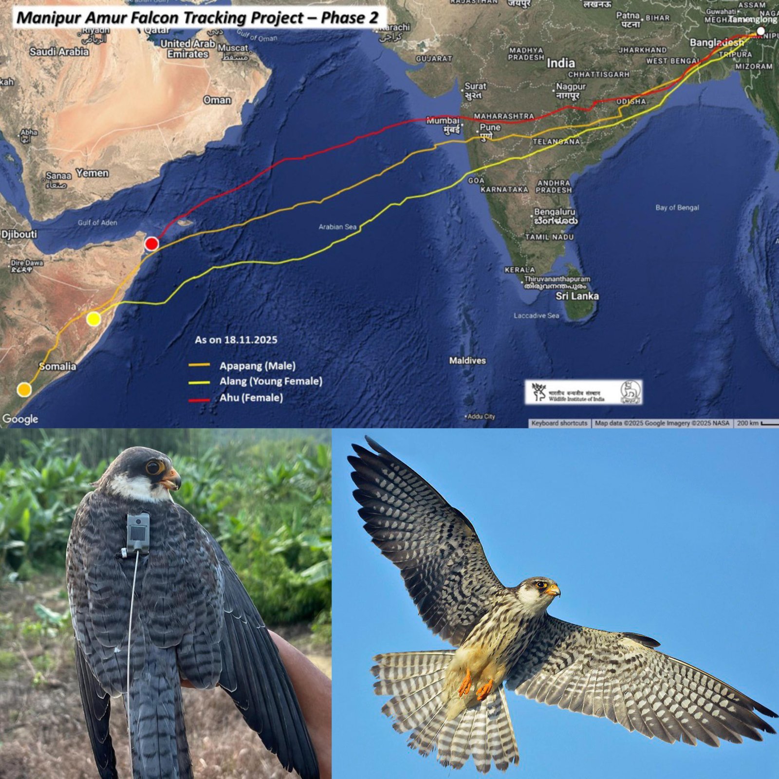 Three Amur Falcons from Manipur have amazed scientists with a record-breaking migration to Kenya in under a week. Apapang flew an astonishing 6,100 km non-stop, while Alang covered 5,600 km with only brief pauses before crossing the ocean. Their journey highlights the extraordinary endurance of these small raptors, which weigh barely 150 grams yet traverse continents with precision. The migration underscores Manipur’s role as a critical stopover for Amur Falcons, celebrated for their resilience and ecological importance. Researchers say the feat is a breathtaking reminder of how nature’s smallest wings can carry the biggest stories, inspiring conservation efforts and global admiration for these remarkable birds. (PC: X)