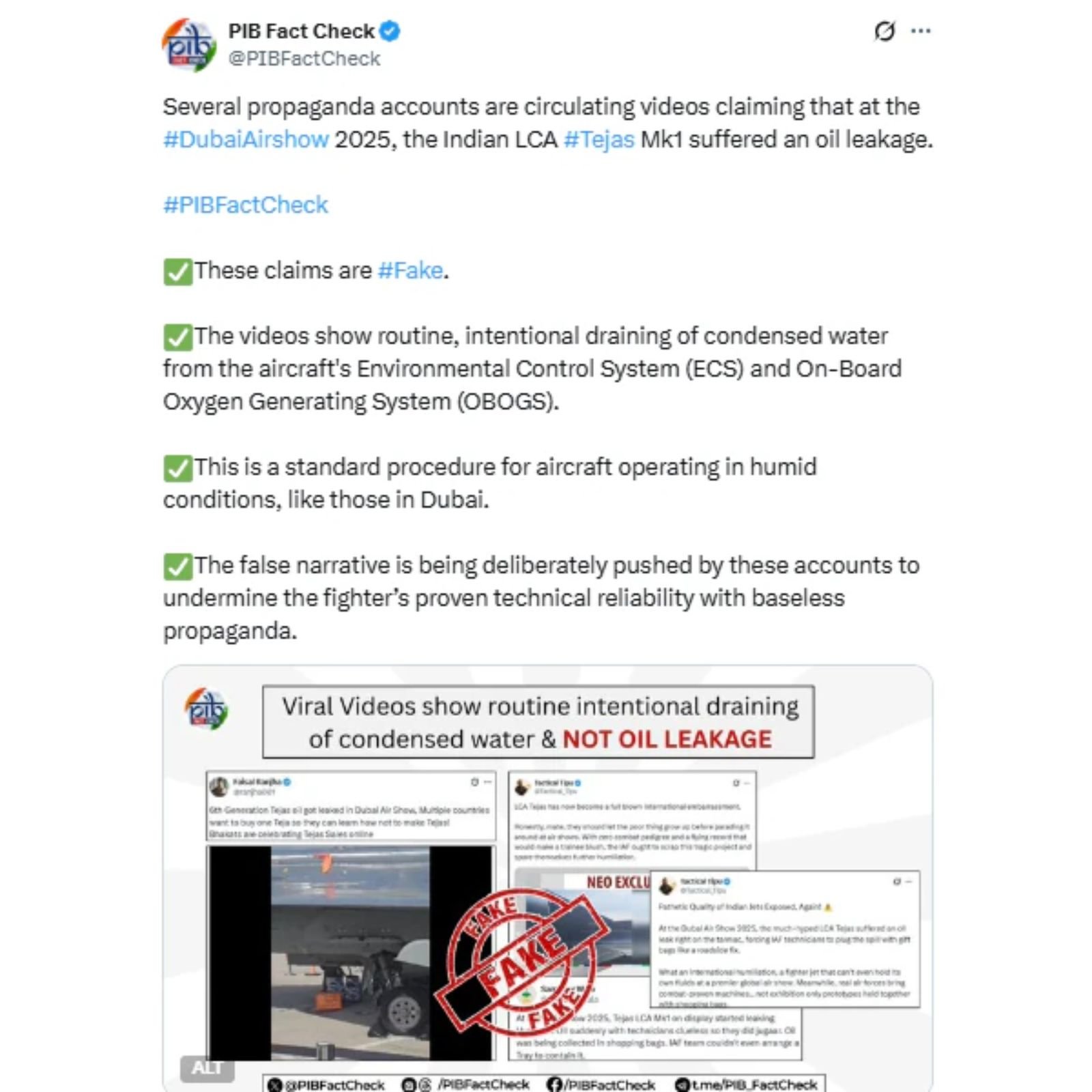 An IAF Tejas Mk1 crashed during the Dubai Airshow on Friday, killing the pilot, just one day after the PIB fact-check unit debunked "oil leakage" propaganda. The government had clarified that circulating videos showed routine water draining from the aircraft's Environmental Control System, not technical failure, calling the narrative "deliberately pushed" to undermine the jet's reliability. The crash occurred during aerial manoeuvres at Al Maktoum International Airport. While some speculate sabotage, aviation experts urge restraint pending the court of inquiry. This marks only the second Tejas crash in 24 years, following a March 2024 Rajasthan incident where pilots ejected safely. The HAL-developed fighter has served since 2016.(PC: India Today)