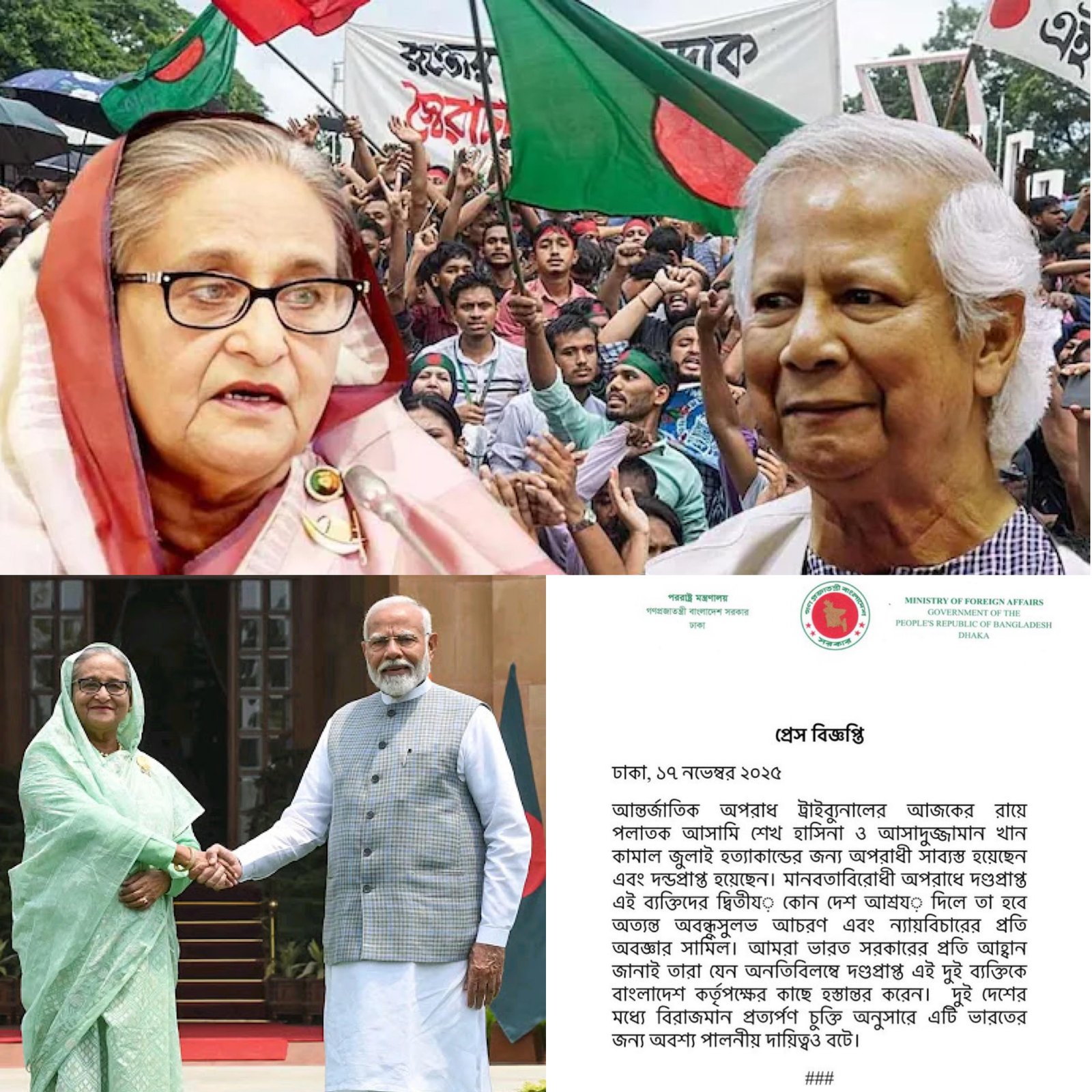 Bangladesh has asked India to hand over former prime minister Sheikh Hasina after a special tribunal sentenced her to death in absentia. The foreign ministry said India has an “obligatory responsibility” under the extradition treaty to send her back. It warned that giving refuge to those convicted of crimes against humanity would be an “unfriendly act”. The tribunal found Hasina guilty of ordering and failing to stop killings during student protests last July. Hasina, now in a safe house in Delhi, called the verdict “rigged” and politically driven. Bangladesh is set to hold elections in February 2026. (PC: HT)