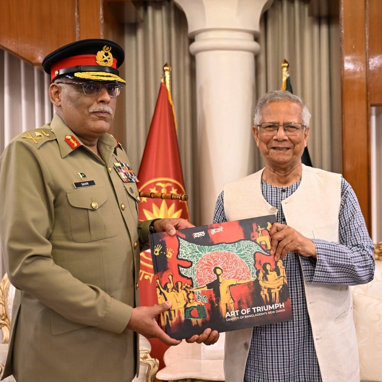 Bangladesh’s chief advisor Muhammad Yunus has sparked a major diplomatic row after gifting a book with a distorted map to Pakistan’s General Sahir Shamshad Mirza. The map on the cover shows India’s northeastern states as part of Bangladesh. The book, Art of Triumph: Bangladesh’s New Dawn, celebrates Bangladesh’s 2024 student movement. The image has drawn strong criticism in India, as it mirrors the “Greater Bangladesh” idea promoted by Islamist groups. Relations between India and Bangladesh have been tense since Sheikh Hasina fled to India in 2024, while Yunus seeks closer ties with Pakistan and China. (PC: X)