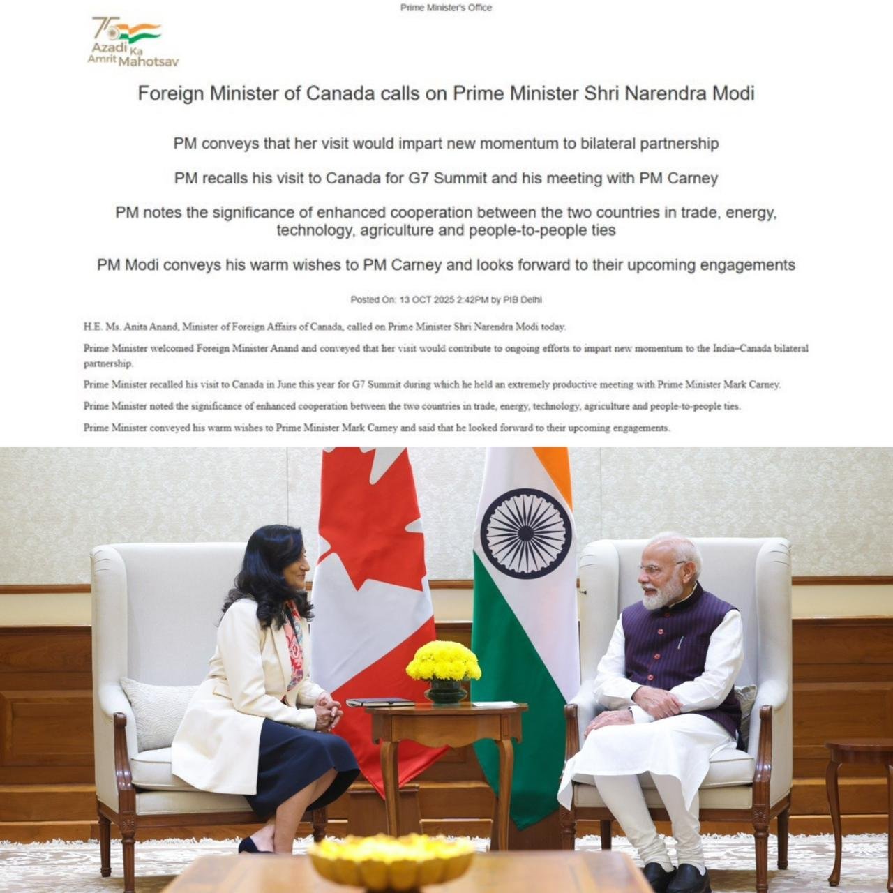 Canadian Foreign Minister Anita Anand met Prime Minister Narendra Modi in New Delhi on Monday, marking her first visit in this capacity. The meeting focused on strengthening bilateral cooperation in trade, technology, energy, agriculture, and people-to-people exchanges. Modi recalled his productive June 2025 meeting with Canadian PM Mark Carney at the G7 Summit and expressed optimism about future engagements. Anand emphasized elevating the bilateral relationship while maintaining security dialogue and expanding economic ties. External Affairs Minister S Jaishankar also met Anand, agreeing on an ambitious cooperation roadmap. This visit follows improved relations after Liberal Party leader Mark Carney's April election victory, helping reset ties that deteriorated following Justin Trudeau's 2023 allegations regarding the Nijjar case. (PC: X)
