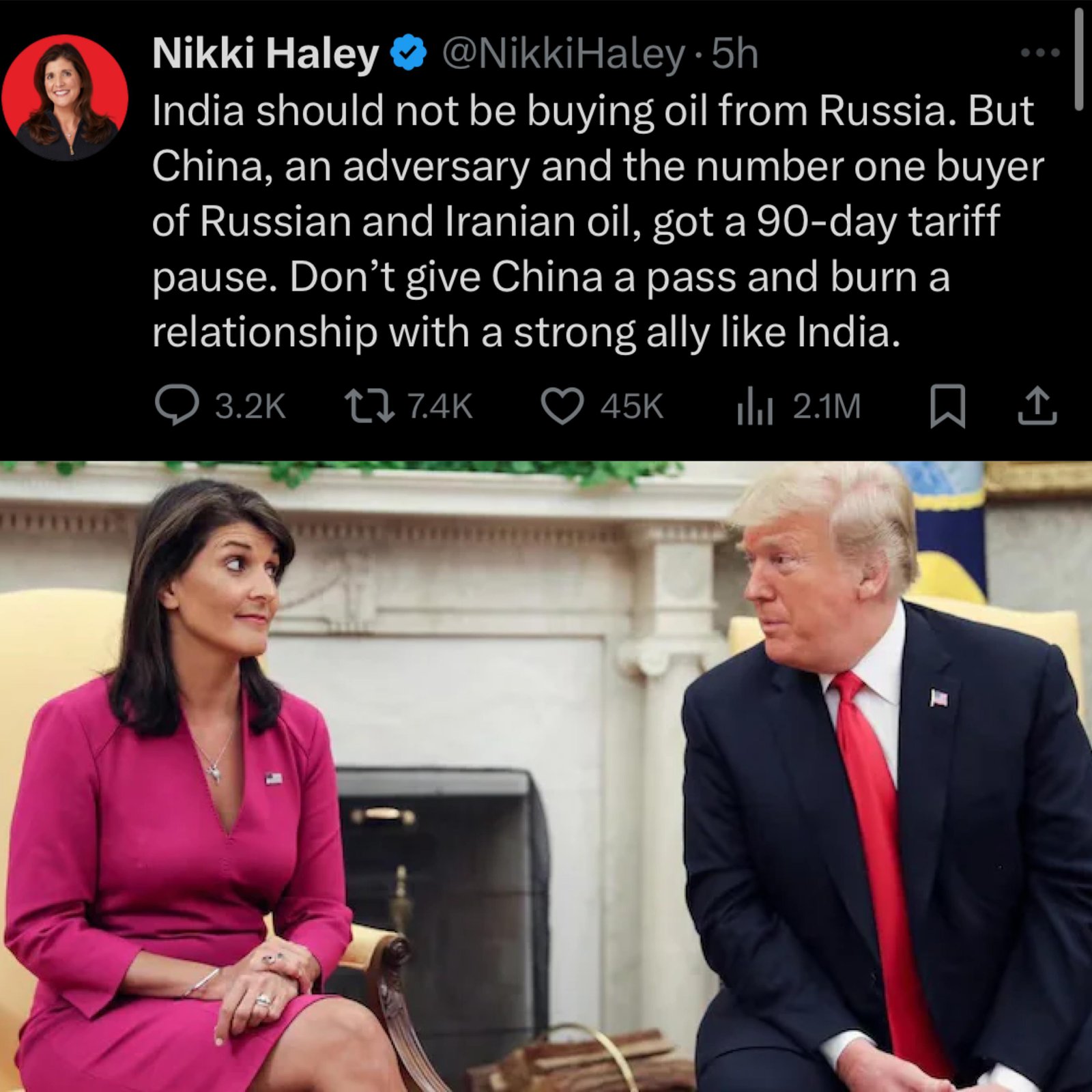 Former U.S. Ambassador to the UN Nikki Haley has sharply criticized Donald Trump’s proposed tariff hike on Indian exports over Russian oil purchases. In a post on X, Haley warned against “burning ties” with India while giving China, a major buyer of Russian and Iranian oil a 90-day tariff pause. She emphasized that India is a key democratic ally in countering China’s global influence and urged Trump to avoid undermining strategic partnerships. Her remarks follow Trump’s announcement of a 25% tariff on Indian goods, with threats of further penalties. Haley’s intervention adds a new dimension to the escalating trade tensions and highlights internal Republican divisions over foreign policy and economic strategy. (PC: India Today)