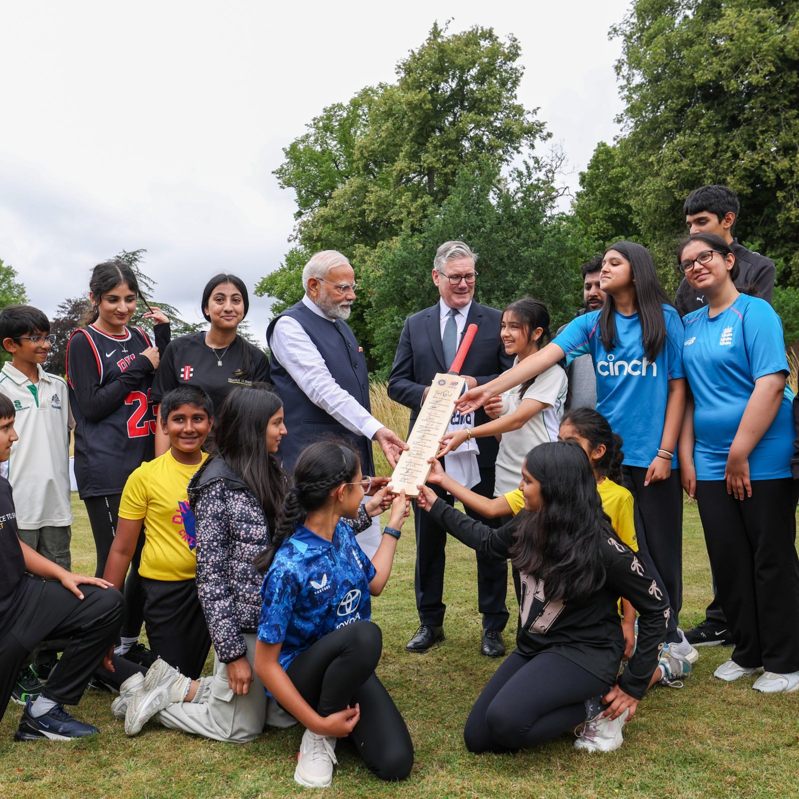 During his UK visit, PM Narendra Modi met young players from Buckinghamshire Street Cricket Hubs alongside UK PM Keir Starmer. At Chequers, Modi gifted a bat signed by India’s 2024 T20 World Cup-winning team, highlighting cricket’s role in India-UK people-to-people ties. Modi used a cricket metaphor to describe bilateral ties: “There may be a swing and a miss at times, but we always play with a straight bat.” The leaders signed a Comprehensive Economic and Trade Agreement and endorsed India-UK Vision 2035, boosting market access, skilled migration, and business partnerships between the two democracies. (PC: X)