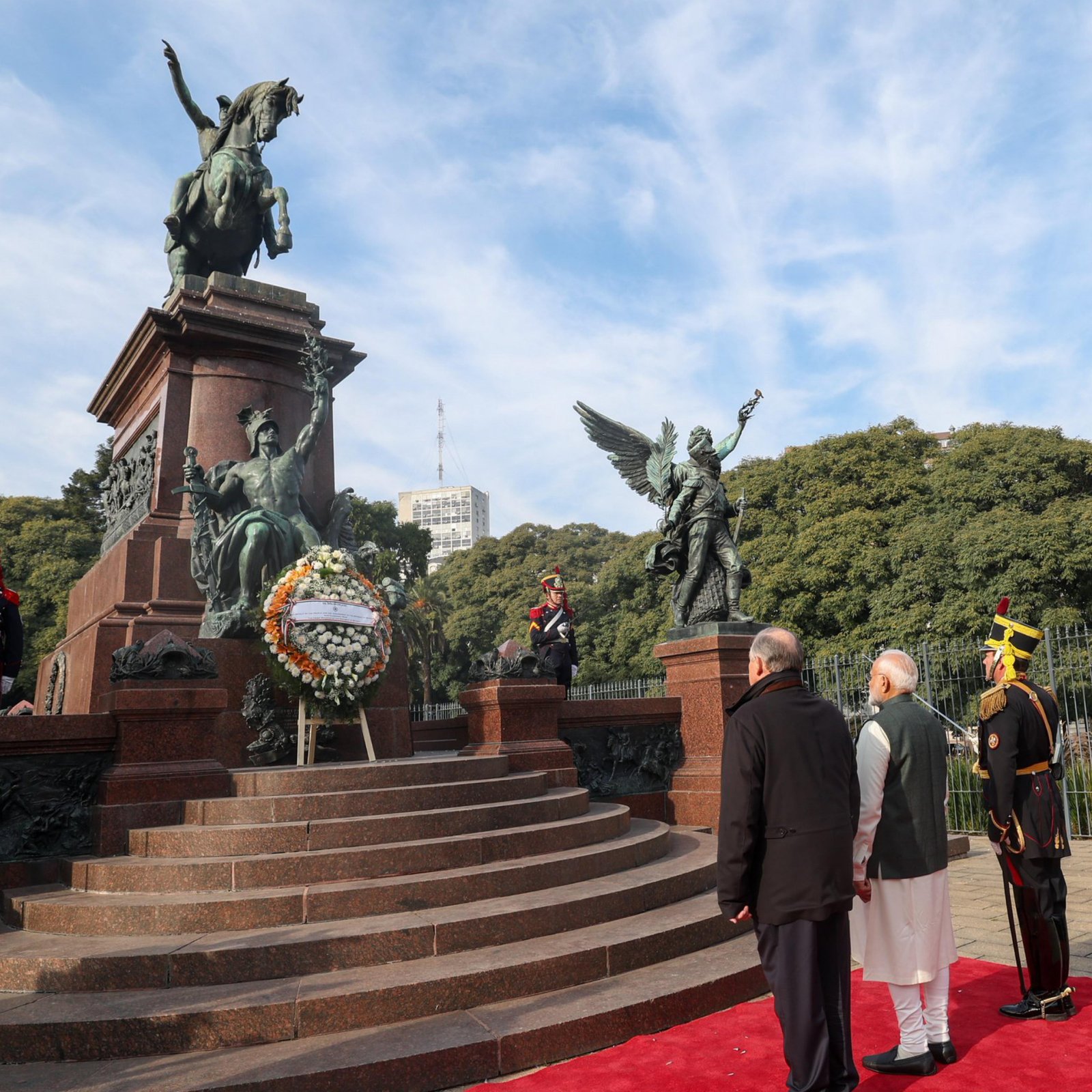 Prime Minister Narendra Modi arrived in Buenos Aires on July 5 during his five‑nation tour’s third leg. Argentine President Javier Milei warmly welcomed him, with both leaders sharing a hug outside the presidential palace and engaging in delegation‑level talks. Modi paused to pay tribute at the San Martín Memorial and met enthusiastic Indian diaspora members, who greeted him with traditional dance and chants of “Modi‑Modi” and “Bharat Mata ki Jai.” Ahead of the BRICS Summit in Rio (July 6–7), Brazil is planning a cultural reception featuring a devotional performance of “Jai Jagadamba Maa Durga” by a Brazilian music ensemble. Modi’s agenda focuses on enhancing cooperation in defence, agriculture, energy, trade, and cultural ties with Argentina. (PC: X/Narendra Modi)