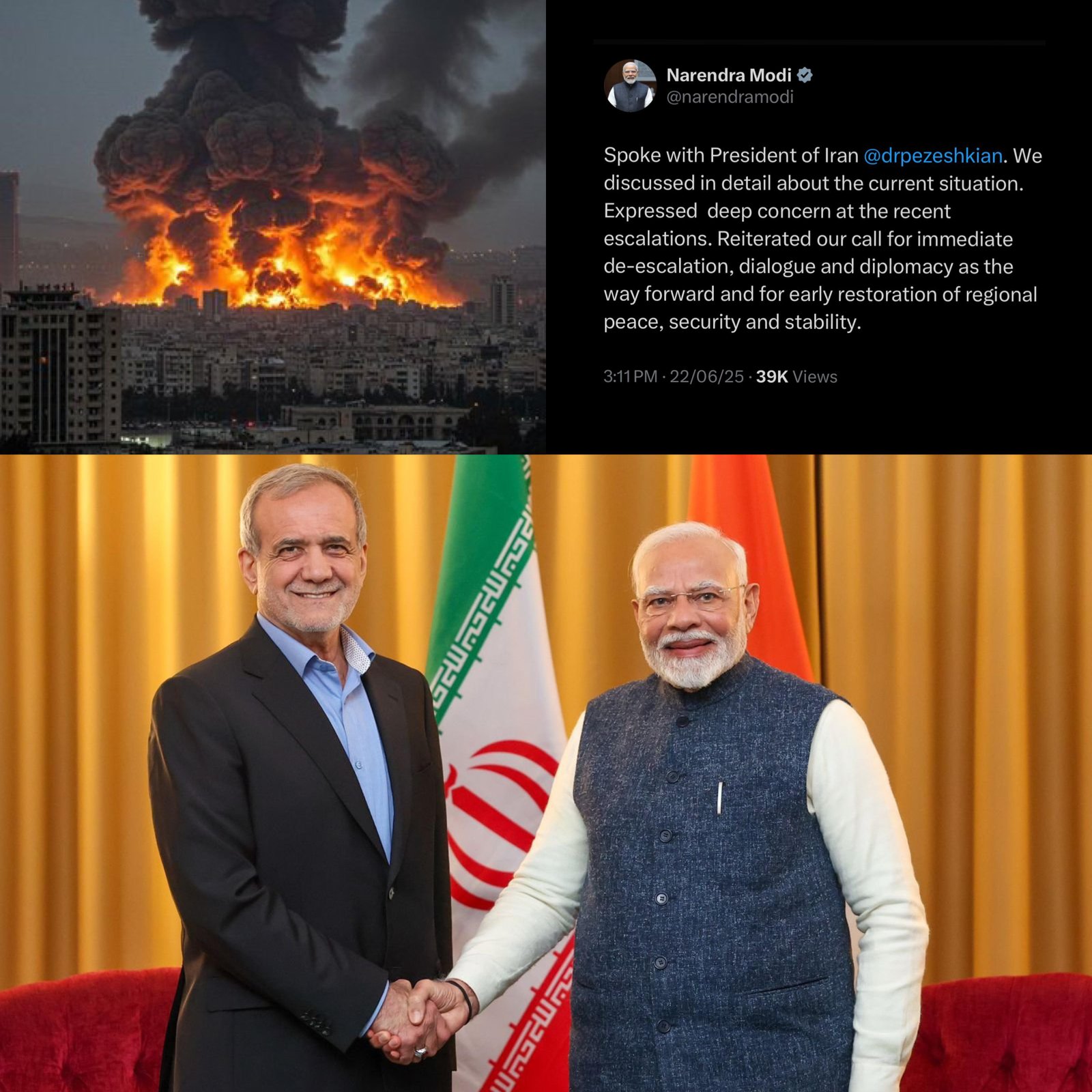 Prime Minister Narendra Modi spoke today with Iranian President Masoud Pezeshkian, expressing deep concern over recent escalations in the region and urging immediate de‑escalation, dialogue, and diplomacy. The leaders discussed the current situation in depth, underlining the urgent need for calm. Modi reiterated India’s commitment to peace and shared diplomatic engagement, while Pezeshkian welcomed the conversation. Both emphasized diplomacy over conflict, reflecting a shared vision for stability amid mounting tensions. The call underscores India’s proactive role in fostering regional dialogue and echoes global appeals for restraint. (PC: X)