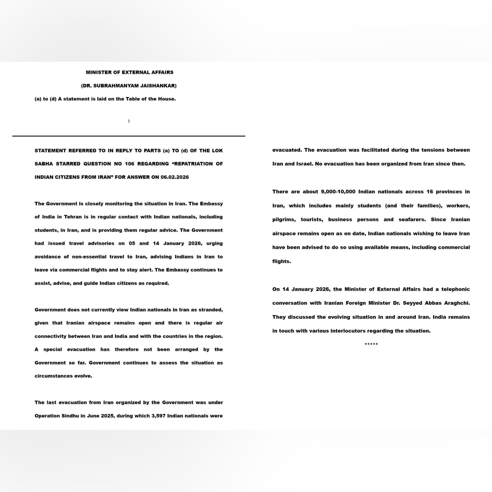 External Affairs Minister S Jaishankar informed Parliament that India is closely monitoring the Iran situation and maintaining regular contact with 9,000-10,000 Indian nationals across 16 provinces, including students, workers, pilgrims, and business persons. The government doesn't view Indians as "stranded" since Iranian airspace remains open with regular connectivity. Special evacuation hasn't been arranged, though Indians wishing to leave are advised to use commercial flights. Jaishankar discussed the situation with Iranian counterpart Abbas Araghchi. This follows deadly anti-government protests since December that killed thousands and arrested tens of thousands, prompting US military threats. India's Budget 2026 allocated zero funds for Chabahar port despite the 2024 operating agreement. (PC: X)