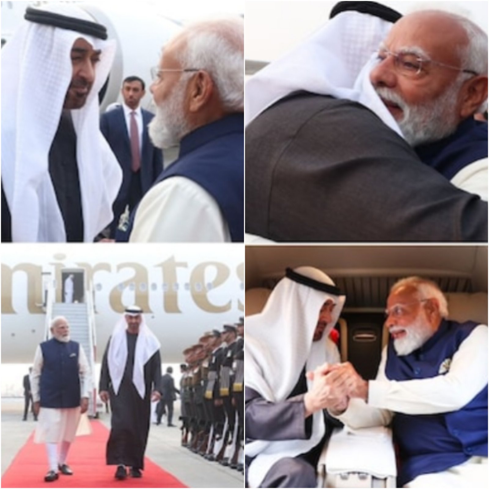 Prime Minister Narendra Modi on Monday received Sheikh Mohamed bin Zayed Al Nahyan at the airport in New Delhi, breaking protocol during the UAE leader’s short visit. The two leaders shared a brief hug before heading for talks. Sheikh Mohamed’s visit lasted about two hours and was held at Modi’s invitation. The Prime Minister later said the visit showed the importance of strong India-UAE ties. The UAE President is on his third official visit to India since taking office. India and the United Arab Emirates cooperate closely in trade, energy, defence and regional security. (PC: India Today)