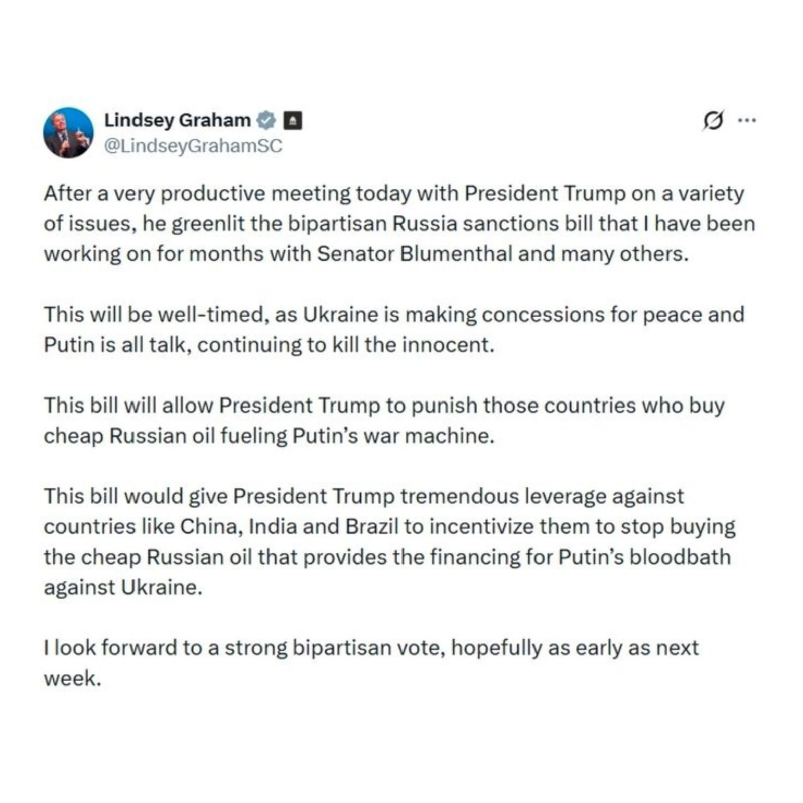Republican Senator Lindsey Graham announced President Donald Trump has approved a bipartisan sanctions bill targeting countries purchasing Russian oil and uranium. The legislation, co-sponsored with Democratic Senator Richard Blumenthal, could impose tariffs up to 500% on nations like India, China, and Brazil. Graham stated it gives Trump "tremendous leverage" to pressure countries financing Putin's war in Ukraine. A vote may occur next week. Trump previously imposed 50% combined tariffs on Indian goods for buying Russian oil. India-US relations have strained over New Delhi's continued Russian oil purchases, with Trump recently stating PM Modi "knew I was not happy." India remains firm on protecting its agricultural and dairy sectors amid stalled negotiations. (PC: X)