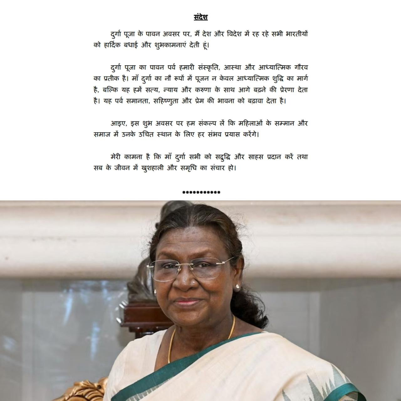 President Droupadi Murmu extended Durga Puja greetings to citizens and Indians abroad, emphasizing women's respect and rights. She highlighted the festival's cultural, spiritual, and faith-based significance, noting that worshipping Maa Durga in nine forms inspires truth, justice, and compassion. The President stressed that Durga Puja promotes equality, tolerance, and love values. Murmu urged everyone to pledge support for women's rights and respect, stating, "On this auspicious occasion, let us pledge to make every possible effort to ensure respect for women and to uphold their rightful place in society." Her message connected the religious symbolism of the goddess with contemporary social imperatives for gender equality and women's empowerment nationwide. (PC: X)
