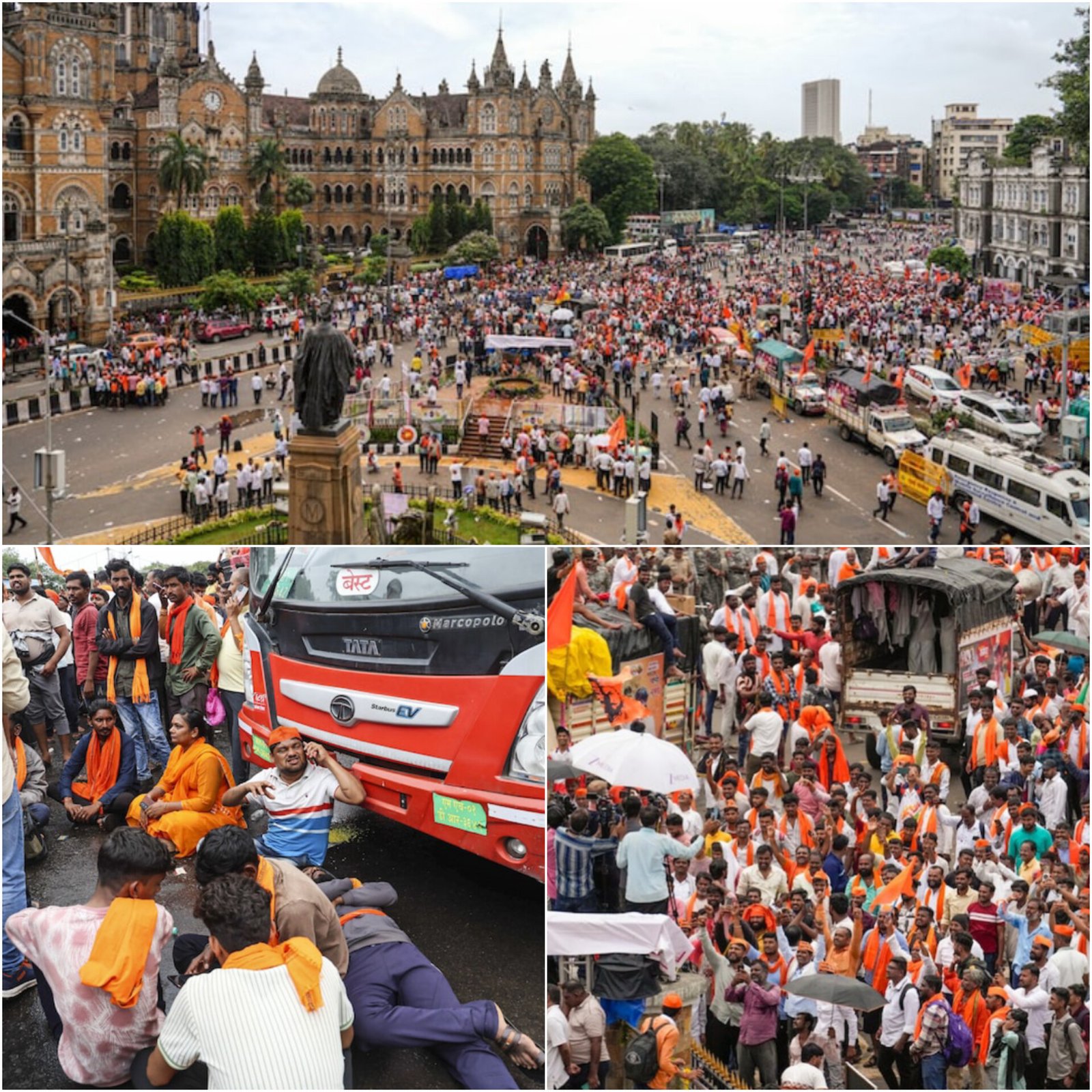 The Bombay High Court on Monday directed activist Manoj Jarange Patil and his supporters to vacate Mumbai roads by Tuesday. The Maratha quota protest, now in its fourth day at Azad Maidan, has paralysed traffic across south Mumbai. Thousands of protesters blocked key routes near CSMT, Fort, Churchgate, and Mantralaya, causing massive jams and road closures. Jarange is demanding a 10 per cent quota for Marathas and has vowed not to leave the city until it is granted. The court said only 5,000 protesters can remain at the site and will review compliance with its order on Tuesday. (PC: India Today)