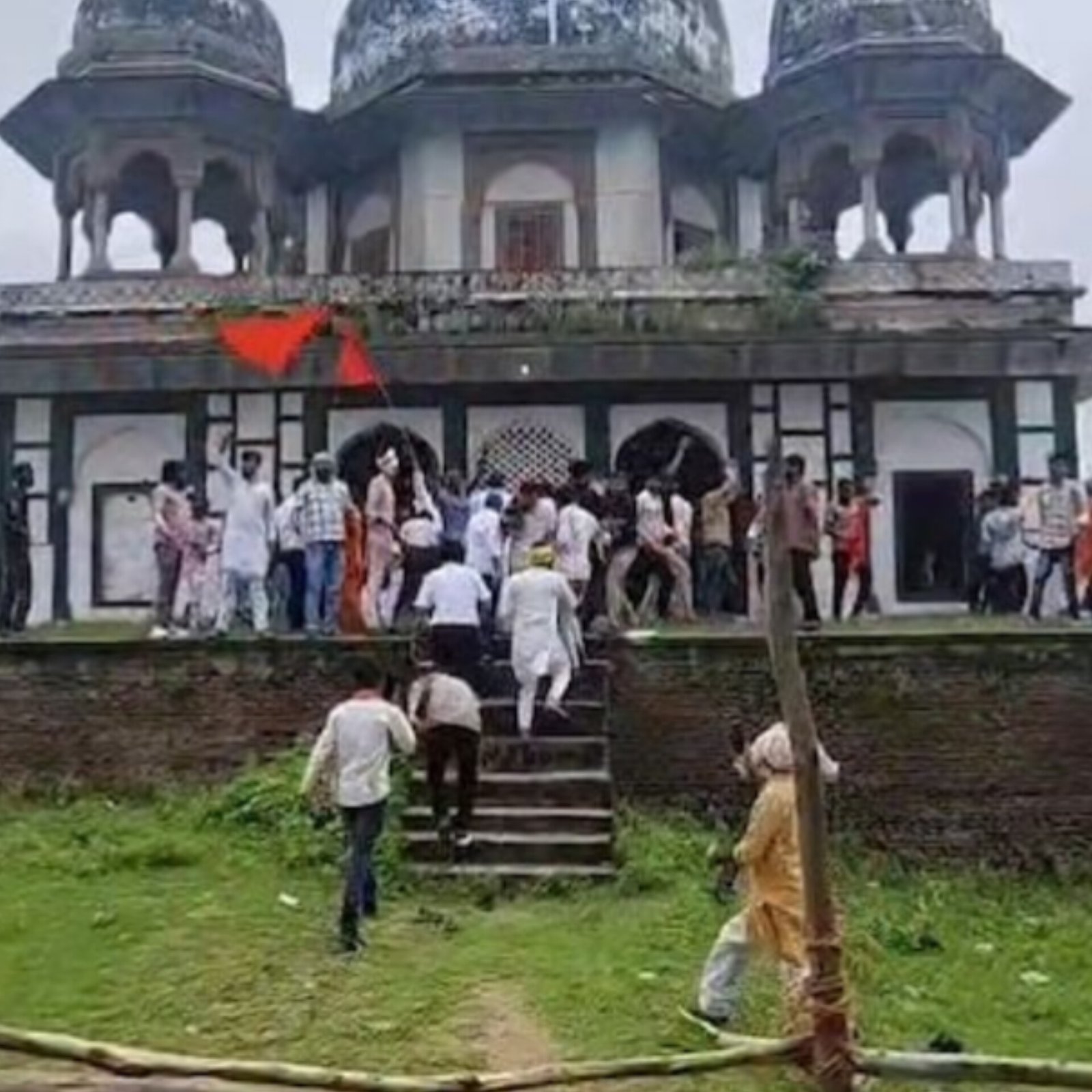 In Uttar Pradesh’s Fatehpur, Members Of A Hindu Organisation Vandalised A Tomb Outside A Mausoleum, Alleging It Was Built Atop A Thousand-Year-Old Temple Dedicated To Thakurji And Lord Shiva. The Site, Recorded In Official Documents As Maqbara Mangi (National Property), Became A Flashpoint After BJP District President Mukhlal Pal And Leaders From Bajrang Dal And VHP Vowed To Perform Pooja There. They Cited Religious Symbols As Proof. Muslim Leaders Condemned The Incident As An Attack On History And Communal Harmony. The District Administration Deployed Heavy Police, PAC Forces, And Barricades To Prevent Further Unrest, Maintaining The Land Is Officially A Tomb. (PC: India Today)
